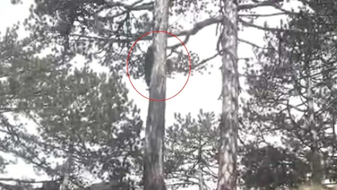 Fatih DALDAL/ BAYRAMİÇ, (Çanakkale), (DHA)-ÇANAKKALE'nin Bayramiç ilçesi sınırları içerisinde kalan Kazdağları’nda motosikletiyle gezen Feridun Güneş (38), çam ağacına tırmanan boz ayıyı görüntüledi.