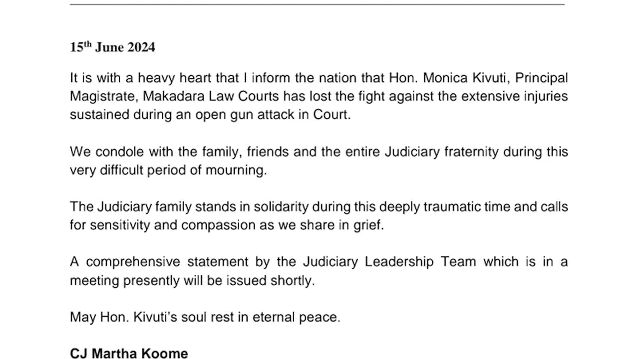 Kenya’nın başkenti Nairobi’de Perşembe günü bir polis, sahte beyanla zimmetine mal ve para geçirme suçlamasıyla yargılanan karısının yargılandığı açık mahkemede, karısının kefalet talebini reddeden hakimi kalçasından ve göğsünden vurmuş, olaya müdahale eden diğer polisler, saldırgan polisin olay sırasında öldürüldüğünü açıklamıştı. Bugün yapılan açıklamada, ağır yaralanan hakimin hayatı kaybettiği duyuruldu. Açıklamada, “Makadara Hukuk Mahkemeleri Baş Yargıcı Sayın Monica Kivuti'nin mahkemede uğradığı silahlı saldırı sonucu aldığı ağır yaralara karşı verdiği mücadeleyi kaybettiğini ulusumuza büyük bir üzüntüyle bildiriyoruz” denildi.