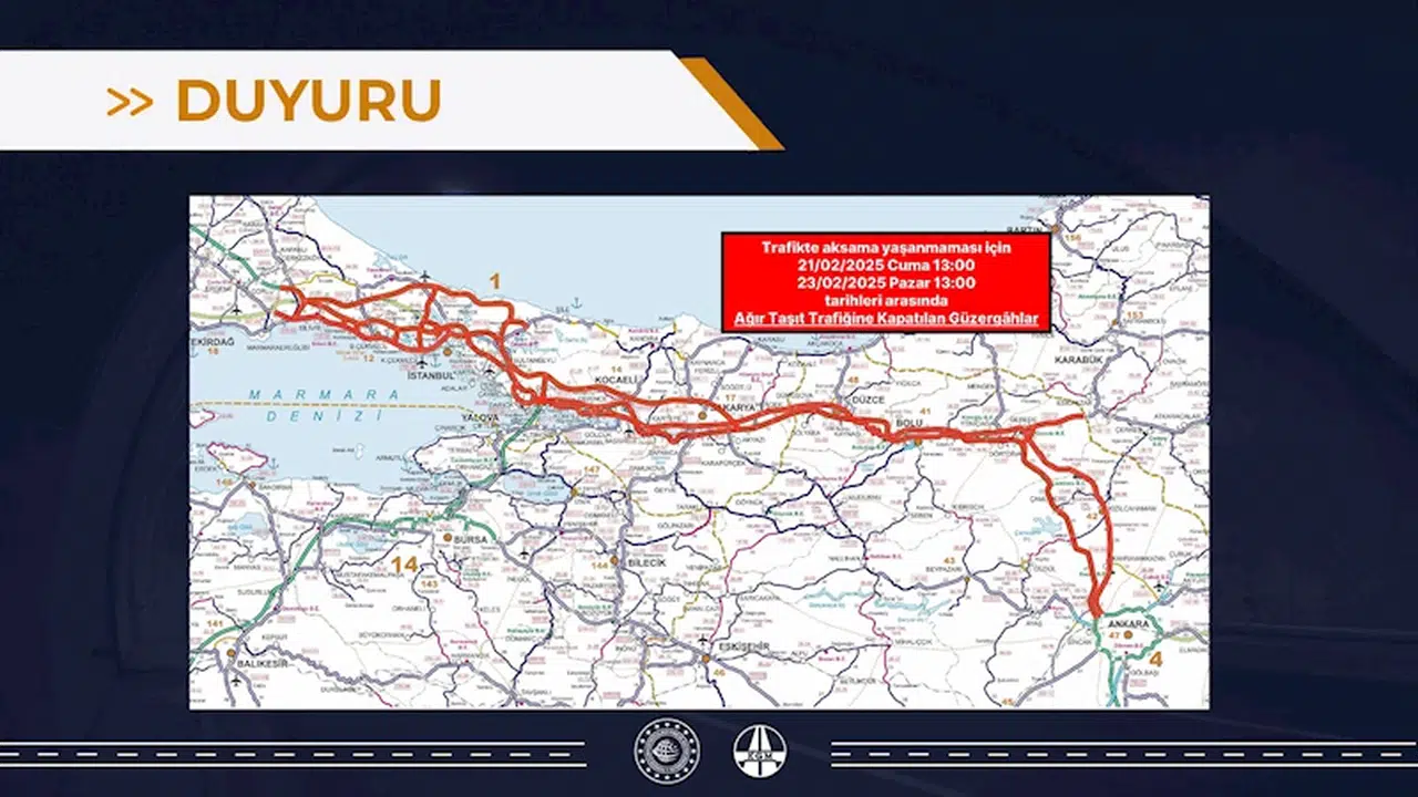 KGM'nin sosyal medya hesabından yapılan açıklamada, "Meteoroloji Genel Müdürlüğü'nce yapılan tahminlere göre; 21 Şubat Cuma günü öğle saatlerinden itibaren Kocaeli, Sakarya ve Düzce illerimiz için turuncu (tehlikeli); İstanbul, Bolu ve Karabük illerimiz için sarı (az tehlikeli) kodlu meteorolojik uyarı verilmiştir. Pazar günü öğle saatlerine kadar devam etmesi beklenen hava şartları nedeniyle kritik yol kesimlerindeki trafik akışında olumsuzlukların yaşanmaması için 21 Şubat Cuma günü (bugün) saat 13.00'ten 23 Şubat Pazar günü saat 13.00'e kadar 2 gün boyunca; kamyon, çekici ve tanker cinsi ağır taşıtların (tedarik sürecinde aksama yaşanmaması gereken araçlar hariç) İstanbul, Kocaeli, Sakarya, Düzce, Bolu ve Ankara illerini kapsayacak şekilde D-100 ve D-750 Devlet Yolları ile TEM ve Kuzey Marmara otoyollarını kullanmalarına izin verilmeyecektir. Bu süreçte sürücülerin trafik işaret ve işaretçilerine uymaları, alternatif güzergahları tercih etmeleri önem taşımaktadır" denildi. (DHA)