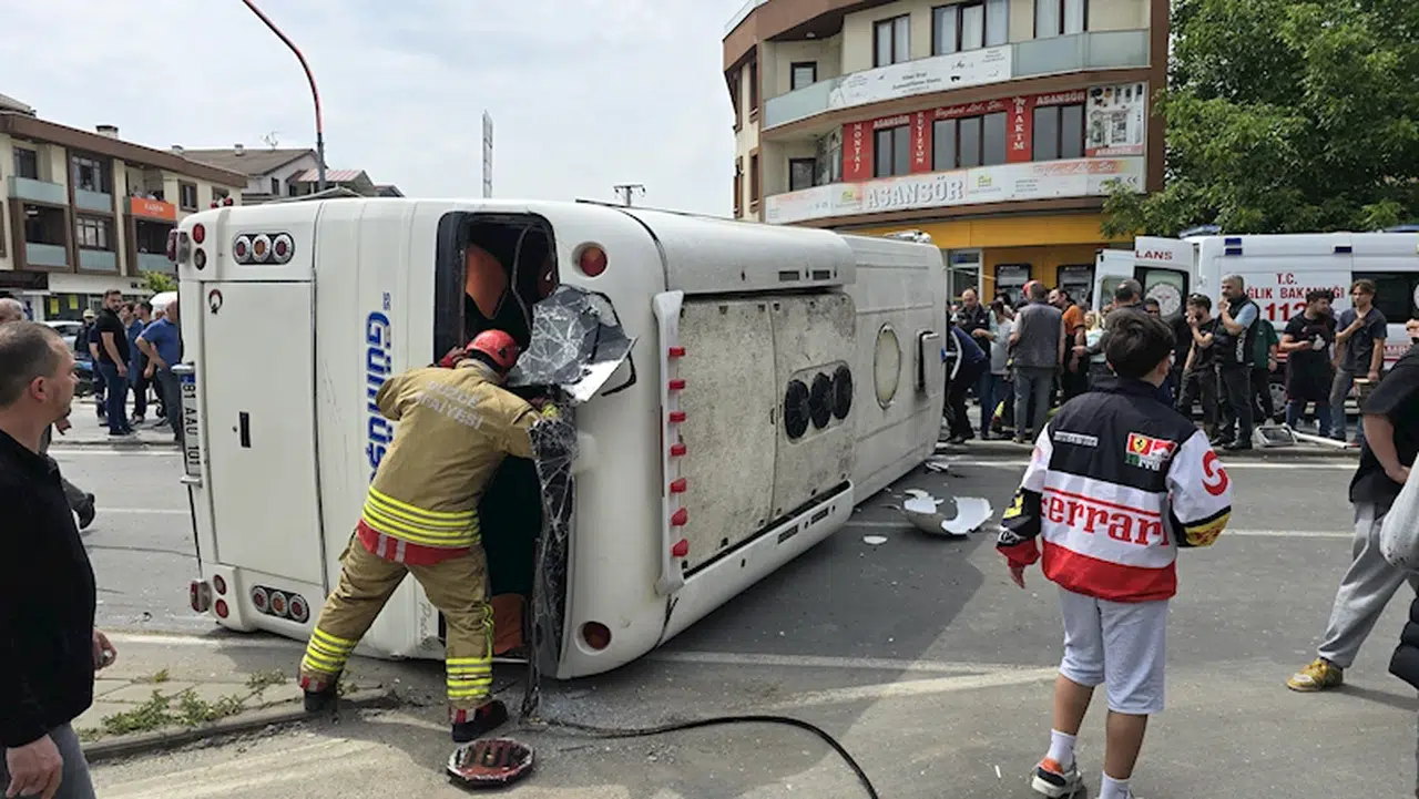 Tezcan SOLMAZ/DÜZCE, (DHA)- DÜZCE'de kırmızı ışıkta geçtiği belirtilen yolcu minibüsüne, otomobil yandan çarptı. Kazada minibüs devrilirken, 7 kişi de yaralandı.