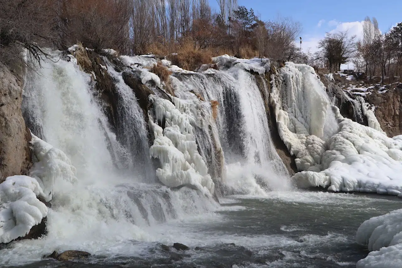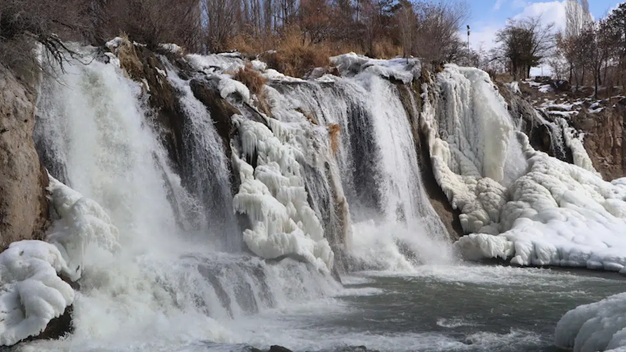 Kısmen donan Muradiye Şelalesi güzel görüntüler oluşturdu