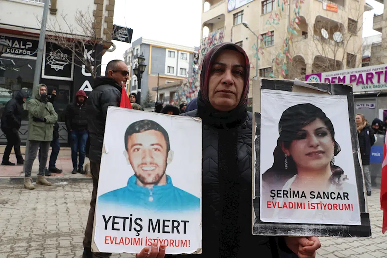 Behçet DALMAZ/VAN, (DHA)- VAN'da dağa kaçırılan çocukları için eylem yapan aileler, 95’inci haftada da Halkların Eşitlik ve Demokrasi Partisi (DEM) binası önüne yürüdü. Eyleme dağa kaçırılan kızı Şerima için katılan Nazlı Sancar, "Kızımı 13 yıl önce kaçırıp PKK'ya götürdüler. 6 yıl kızım için mücadelemi sürdürüyorum. DEM Parti ve PKK'dan hiçbir şey istememişiz, sadece doğurduğumuz evlatlarımızı istiyoruz” dedi.