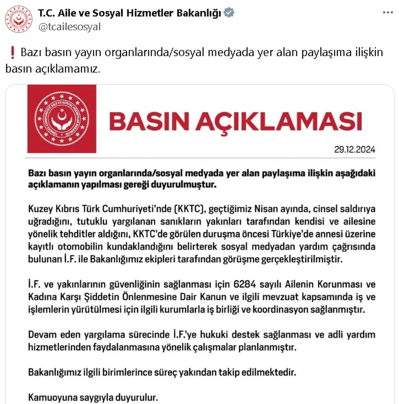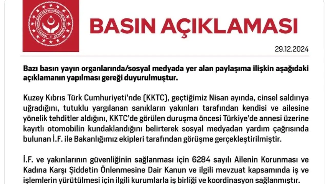 Bakanlığın sosyal medya hesabından yapılan açıklamada, "KKTC'de, geçtiğimiz nisan ayında, cinsel saldırıya uğradığını, tutuklu yargılanan sanıkların yakınları tarafından kendisi ve ailesine yönelik tehditler aldığını, KKTC'de görülen duruşma öncesi Türkiye'de annesi üzerine kayıtlı otomobilin kundaklandığını belirterek sosyal medyadan yardım çağrısında bulunan İ.F. ile bakanlığımız ekipleri tarafından görüşme gerçekleştirilmiştir. İ.F. ve yakınlarının güvenliğinin sağlanması için 6284 sayılı Ailenin Korunması ve Kadına Karşı Şiddetin Önlenmesine Dair Kanun ve ilgili mevzuat kapsamında iş ve işlemlerin yürütülmesi için ilgili kurumlarla iş birliği ve koordinasyon sağlanmıştır. Devam eden yargılama sürecinde İ.F.'ye hukuki destek sağlanması ve adli yardım hizmetlerinden faydalanmasına yönelik çalışmalar planlanmıştır. Bakanlığımız ilgili birimlerince süreç yakından takip edilmektedir" denildi. (DHA)