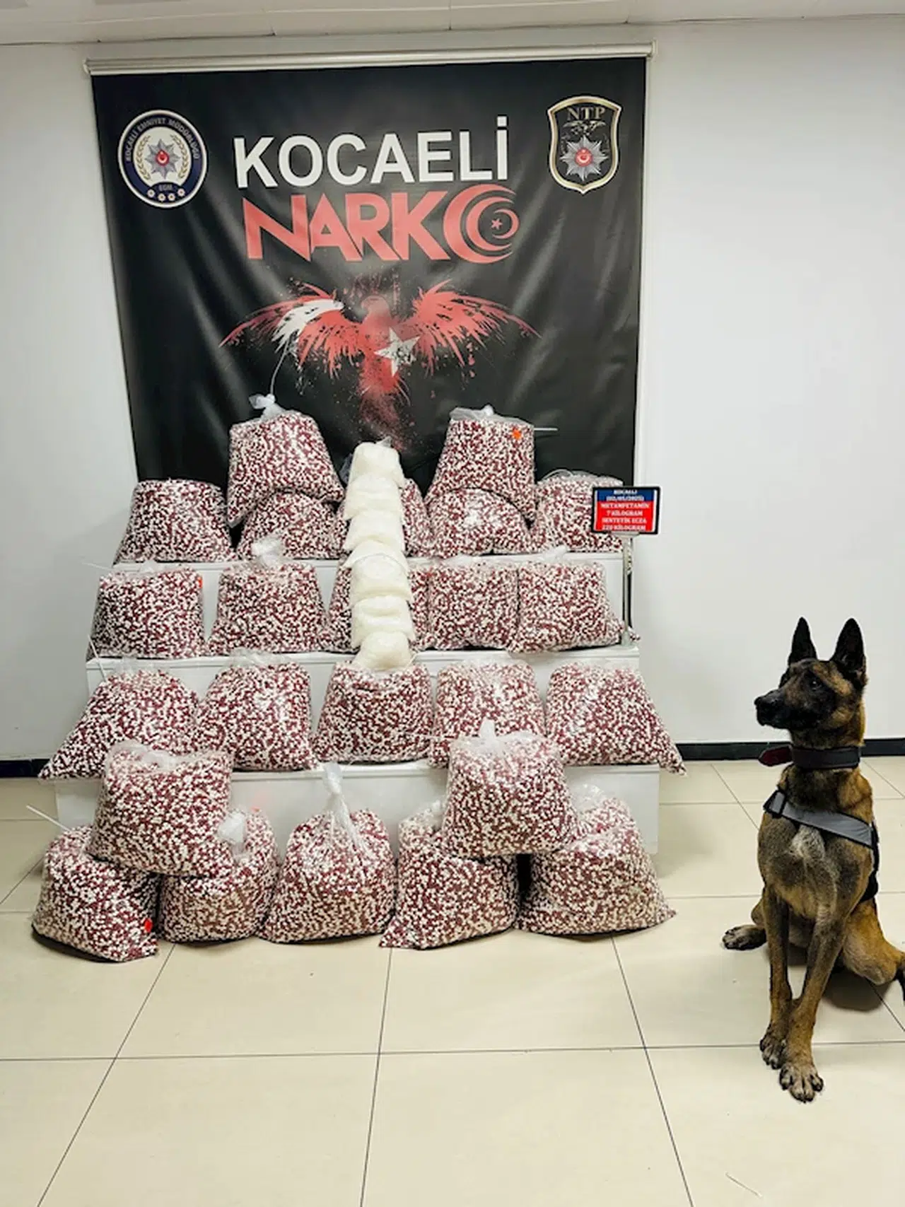 Kocaeli İl Emniyet Müdürlüğü Narkotik Suçlarla Mücadele Şube Müdürlüğü ekipleri, aldıkları istihbarat üzerine Gebze ilçesinde bir kamyonu durdurdu. Polis ekipleri tarafından kamyonda narkotik köpek eşliğinde yapılan aramada; ağırlığı 220 kilogram olan 397 bin sentetik ecza hap ve 7 kilogram metamfetamin ele geçirildi. Olaya ilişkin gözaltına alınan 1 şüpheli, emniyetteki işlemlerin ardından sevk edildiği sulh ceza hakimliği tarafından tutuklandı. (DHA)