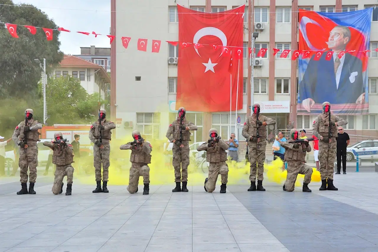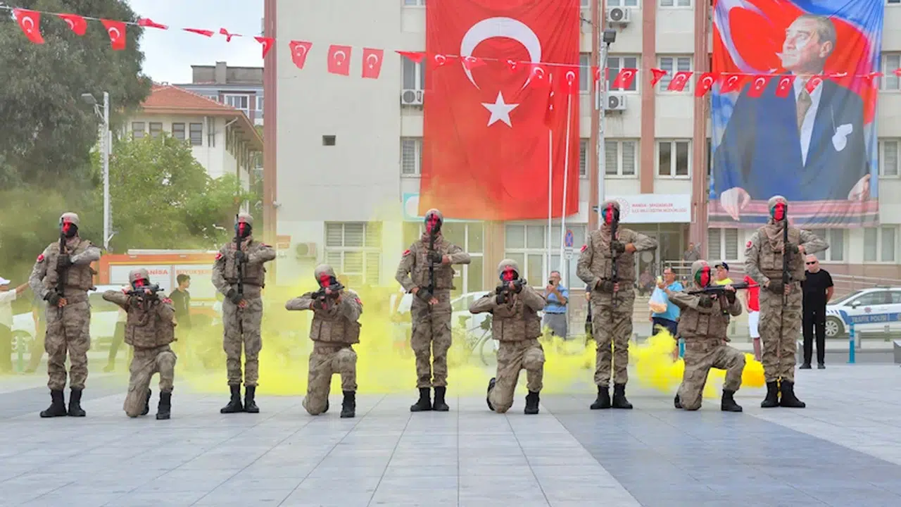 Ersan ERDOĞAN / MANİSA, (DHA)-MANİSA'nın düşman işgalinden kurtuluşunun 102'nci yıl dönümü törenlerle coşkuyla kutlandı. Törende, Kırkağaç Jandarma Komando Eğitim Merkezi Komutanlığı komandolarının tüfekli gösterisi uzun süre ayakta alkışlandı.