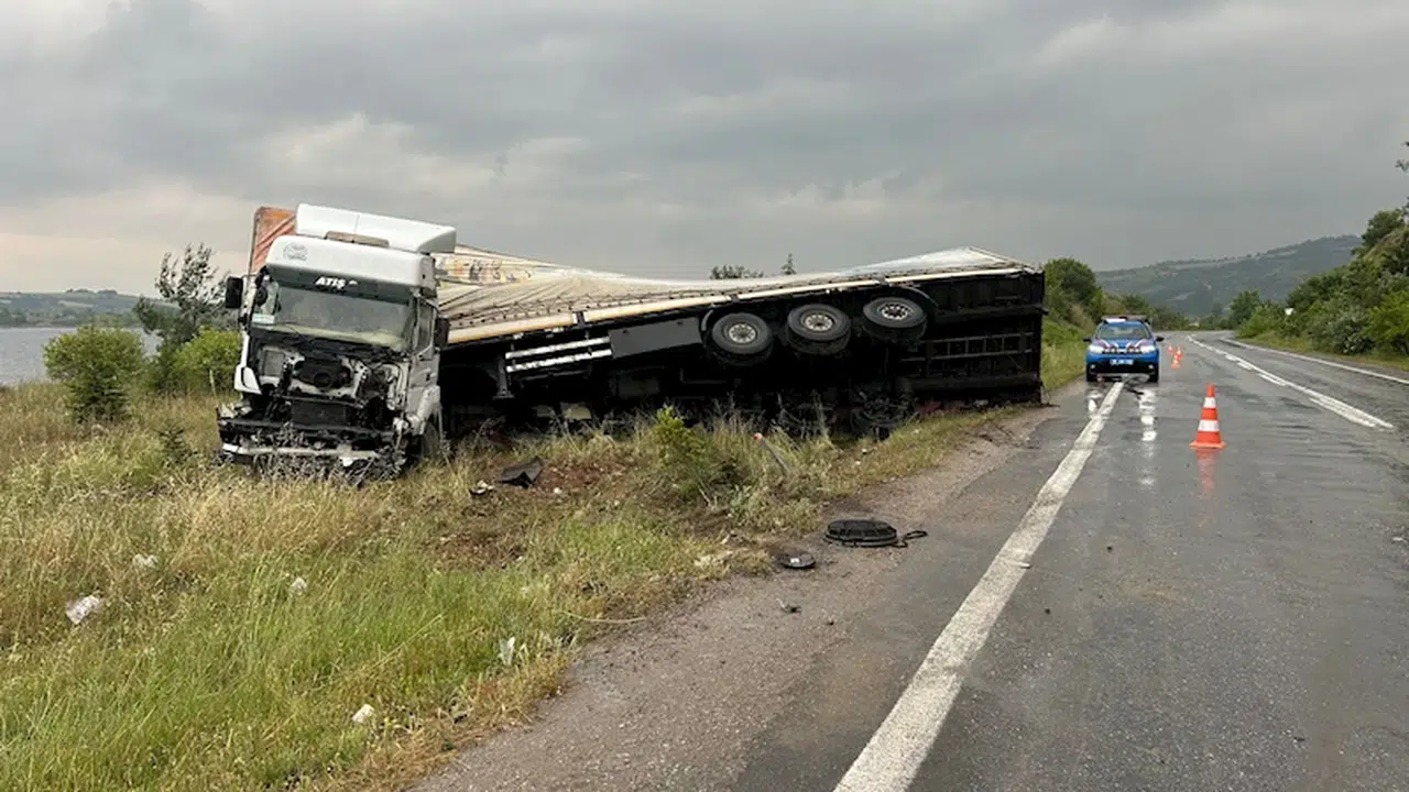 Kontrolden çıkan TIR'ın dorsesine karşı şeritten gelen otomobil çarptı: 3 yaralı