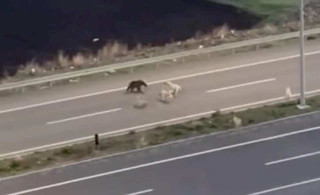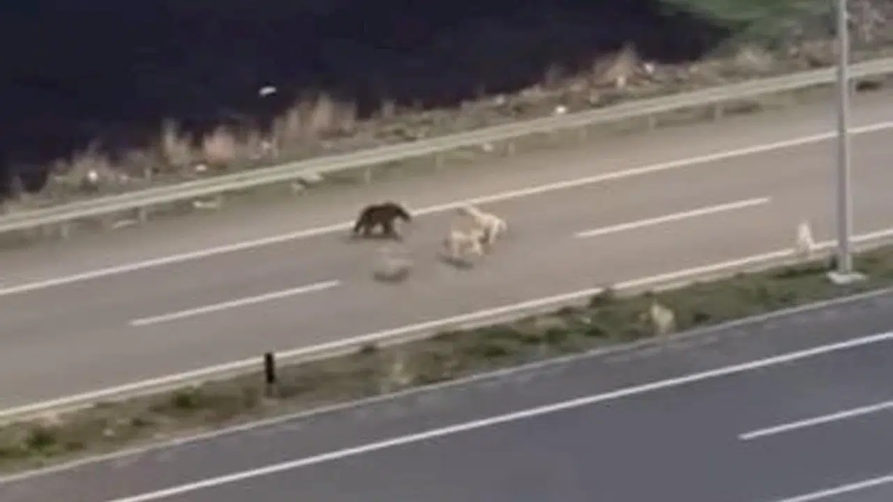 Köpeklerle dalaşıp, halı sahaya giren ayı kamerada