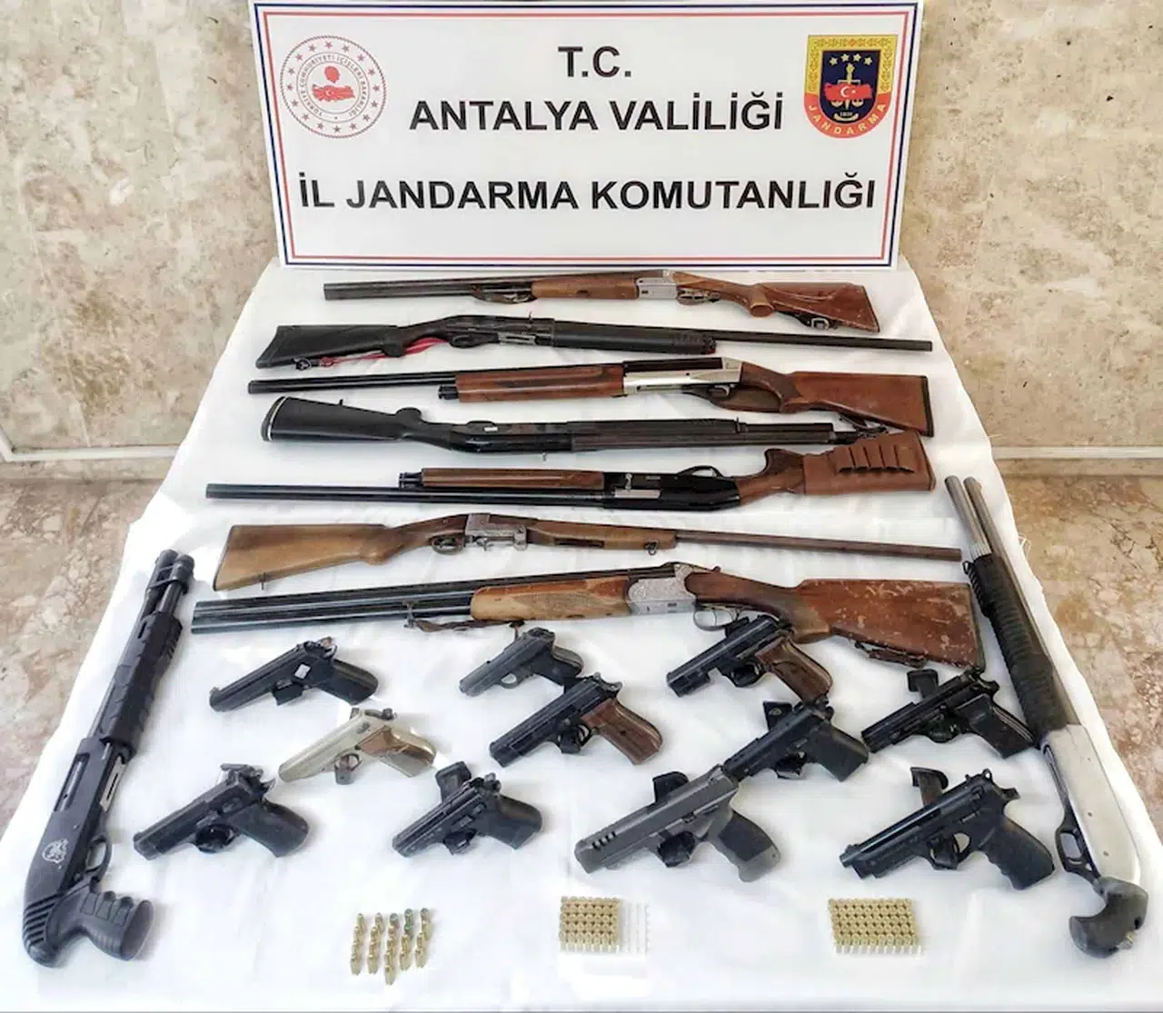 Antalya Cumhuriyet Başsavcılığı'nın talimatları doğrultusunda, Antalya İl Jandarma Komutanlığı ekipleri, ruhsatsız silah ve mühimmat bulunduran şüphelilere yönelik operasyon düzenledi. Korkuteli ilçesinde gerçekleştirilen operasyonda, 10 tabanca, 14 av tüfeği, 11 şarjör, 145 kurusıkı tabanca fişeği, 90 av tüfeği fişeği ve 20 tabanca fişeği ele geçirildi. Olayla ilgili 10 şüpheli hakkında adli ve idari soruşturma başlatıldı. (DHA)
