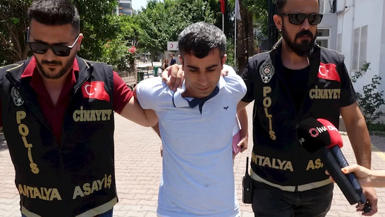 Antalya'da arkadaşı Papatya K.'yi korumak isteyen güvenlik görevlisi Bekir Kılıç'ı bıçakla öldüren kadının eski sevgilisi Metin Almaz, emniyetteki işlemlerinin ardından adliyeye sevk edildi. (DHA)