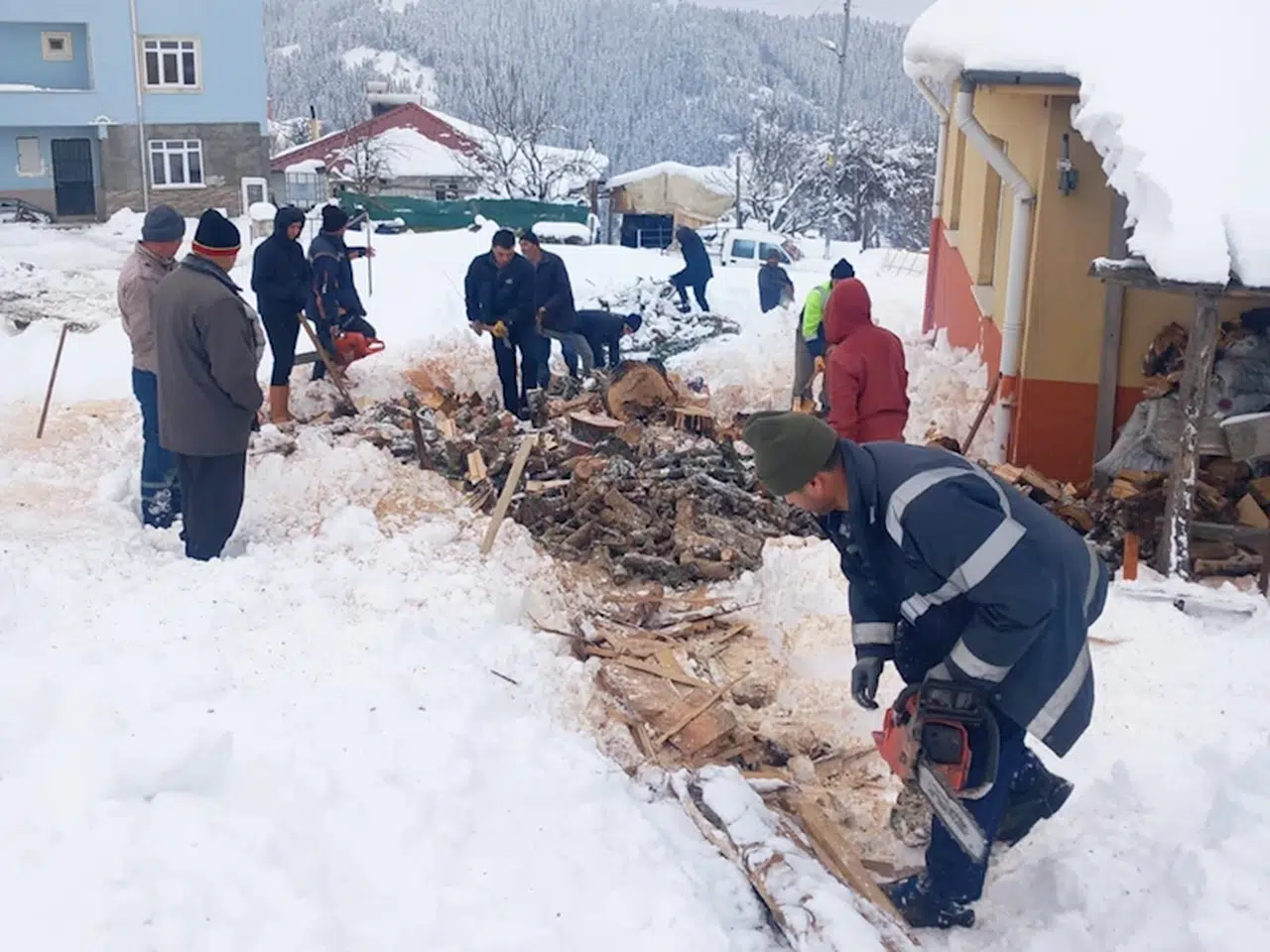 Köylüler el ele verip köy okulunun kışlık odununu kestiler