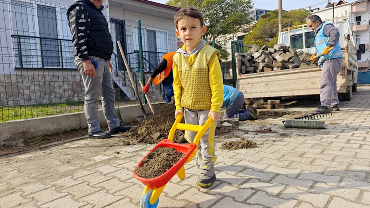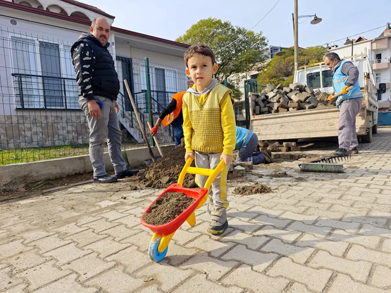 Yakakent Belediyesi tarafından Bahçelievler Mahallesi'nde sürdürülen yol bakım çalışması sırasında belediye işçilerinin yanına oyuncak el arabası ile gelen küçük çocuk, işçilere yardım etmek istedi.