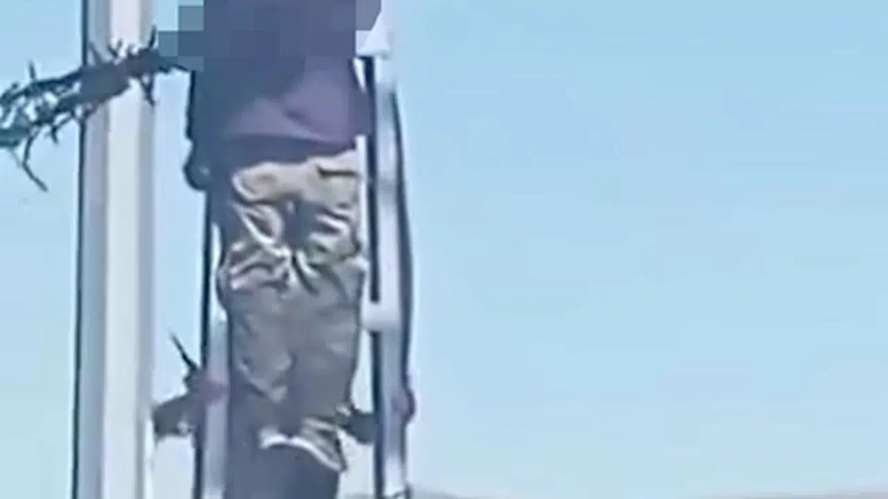 Kayseri'nin Talas ilçesinde kurulan kurban pazarına sakatat ve et toplamak için geldiği öne sürülen Ali B., (45) zabıta görevlileri ile tartışınca elektrik direğine bağladığı iple kendini astığı anlara ilişkin cep telefonu kamerası ile kaydedilen görüntüler ortaya çıktı. Görüntülerde, Ali B.'nin elektrik direğine çıktığı ve kendini iple astığı, bir vatandaşın da hızla direğe tırmanarak ipi kestiği, ardından da Ali B.'nin başının üstüne yere düştüğü görüldü. (DHA)
