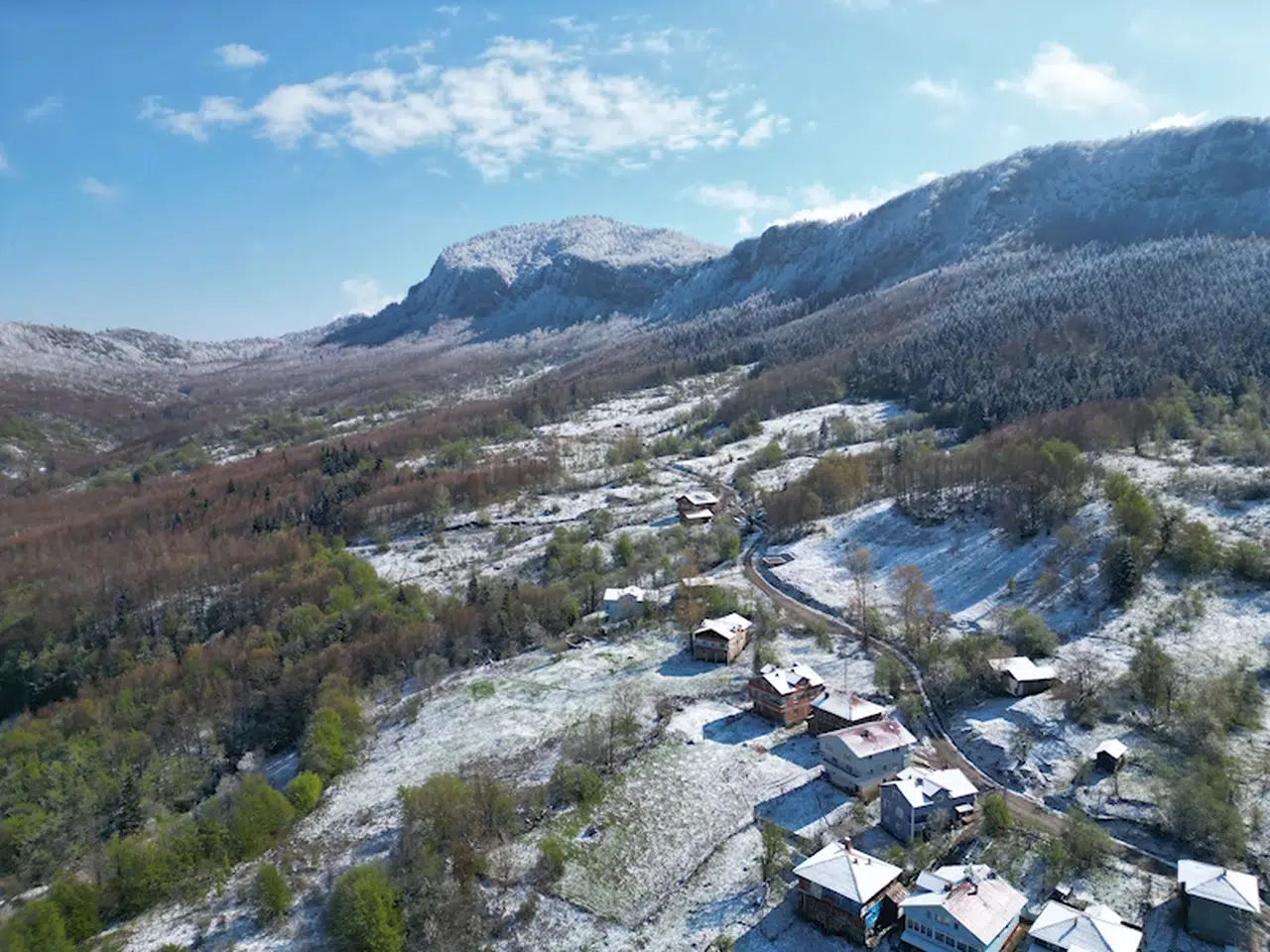 Ayhan ACAR/BARTIN, (DHA)- BARTIN ile Kastamonu sınırları içerisinde yer alan Küre Dağları Milli Parkı, nisan ayında yeşeren ağaçların üzerine yağan kar ile eşsiz güzelliğe büründü. İki mevsimin bir arada yaşandığı milli parktaki manzara, dronla görüntülendi.