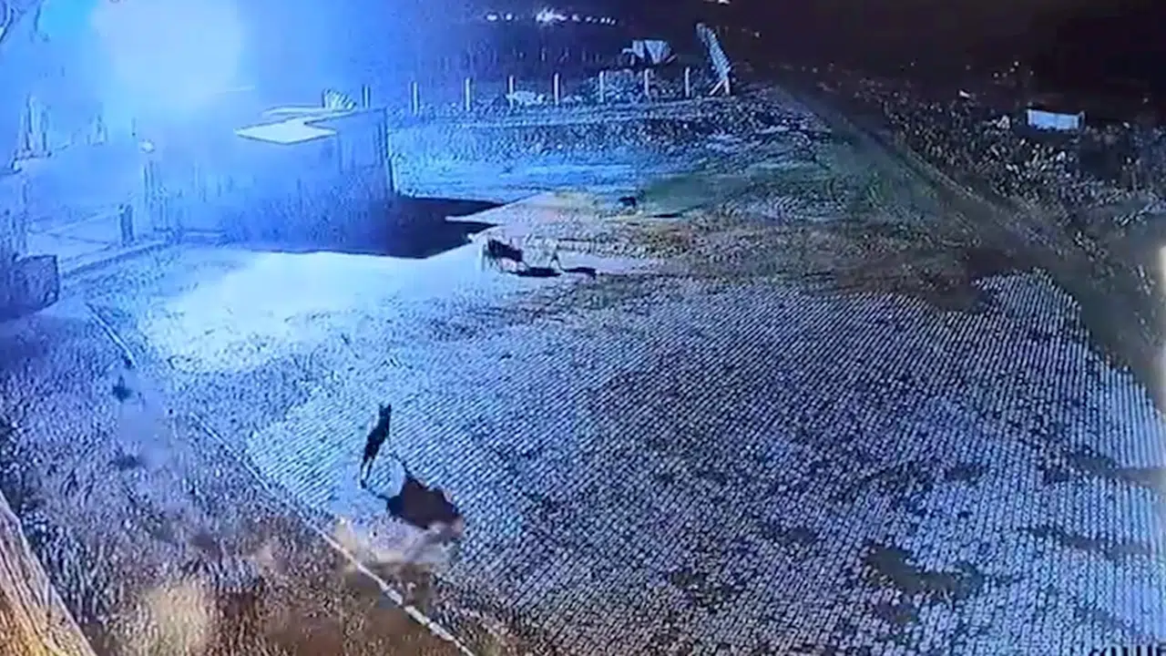 Selda FIRAT/GÜMÜŞHANE, (DHA)- GÜMÜŞHANE'de firmaya ait depodaki bekçi köpeği, köye inen kurt sürüsünün saldırısına uğradı. O anlar, güvenlik kamerasına yansıdı.