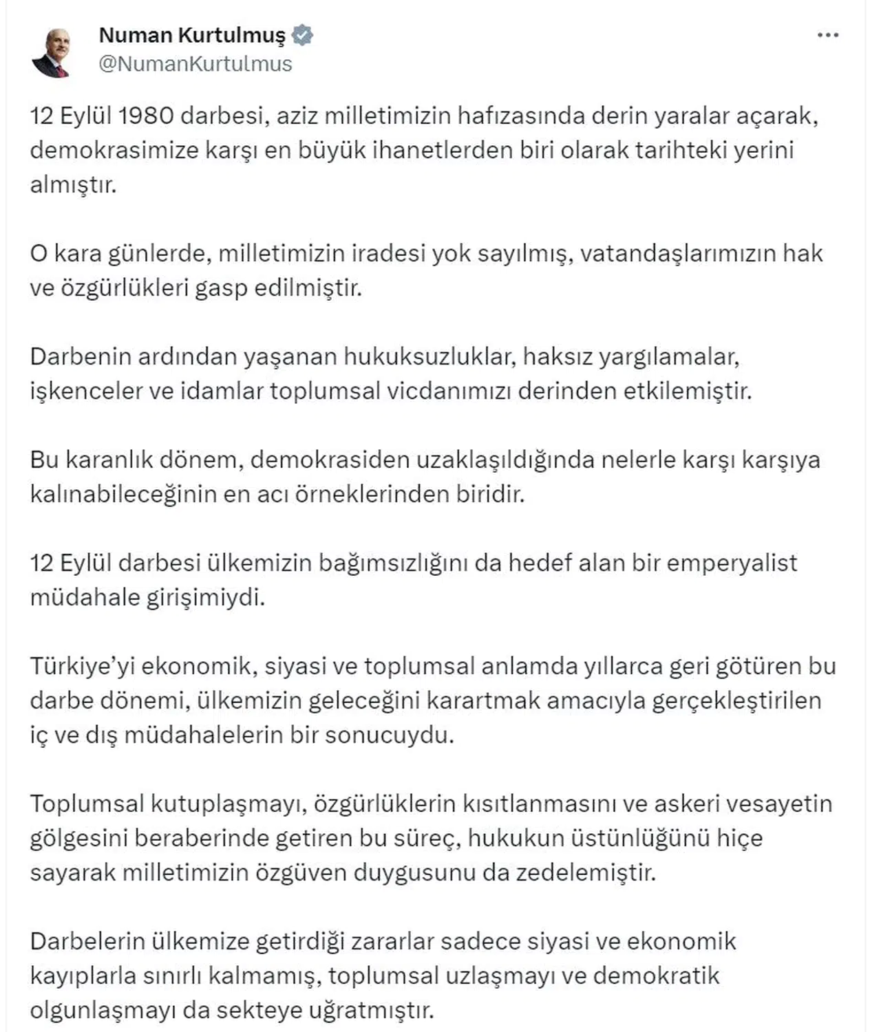 TBMM Başkanı Numan Kurtulmuş, 12 Eylül 1980 darbesinin yıl dönümü nedeniyle sosyal medya hesabından bir mesaj yayımladı. Kurtulmuş, "12 Eylül 1980 darbesi, aziz milletimizin hafızasında derin yaralar açarak, demokrasimize karşı en büyük ihanetlerden biri olarak tarihteki yerini almıştır. O kara günlerde, milletimizin iradesi yok sayılmış, vatandaşlarımızın hak ve özgürlükleri gasbedilmiştir. Darbenin ardından yaşanan hukuksuzluklar, haksız yargılamalar, işkenceler ve idamlar toplumsal vicdanımızı derinden etkilemiştir. Bu karanlık dönem, demokrasiden uzaklaşıldığında nelerle karşı karşıya kalınabileceğinin en acı örneklerinden biridir. 12 Eylül darbesi ülkemizin bağımsızlığını da hedef alan bir emperyalist müdahale girişimiydi. Türkiye'yi ekonomik, siyasi ve toplumsal anlamda yıllarca geri götüren bu darbe dönemi, ülkemizin geleceğini karartmak amacıyla gerçekleştirilen iç ve dış müdahalelerin bir sonucuydu. Toplumsal kutuplaşmayı, özgürlüklerin kısıtlanmasını ve askeri vesayetin gölgesini beraberinde getiren bu süreç, hukukun üstünlüğünü hiçe sayarak milletimizin özgüven duygusunu da zedelemiştir" ifadelerini kullandı.