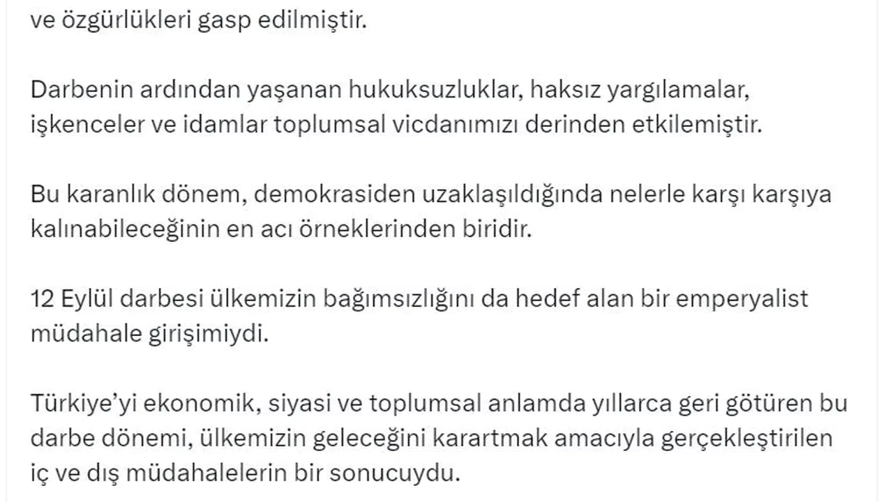 "Her darbe, her alanda Türkiye'yi geriye götüren büyük ihanetler olarak hafızalara kazınmıştır. Artık darbelerin izlerini geride bırakarak, darbe dönemlerinden kalan en büyük kalıntılardan biri olan 1982 Anayasası'ndan kurtulma vakti gelmiştir. Nasıl ki, 12 Eylül'ün toplumsal, siyasi ve ekonomik bedelleri milletimizin kararlılığıyla aşılmışsa, şimdi de darbe anayasasını tarihin çöplüğüne atmak ve milletimizin iradesini tam anlamıyla yansıtan, demokrat, sivil, kapsayıcı ve özgürlükçü bir anayasa yapmak en büyük görevimizdir. Ancak böyle bir anayasa, toplumun her kesimini kucaklayan, kimsenin ötekileştirilmediği, hukukun üstünlüğünün tam anlamıyla sağlandığı bir ortamı temin edebilir. Katılımcı demokrasiye dayanan, insan hak ve özgürlüklerini güvence altına alan, toplumsal uzlaşmayı ve adaleti sağlayan bir anayasa, ülkemizin huzur ve güven içinde geleceğe yürümesinin en büyük güvencesidir. Türkiye'nin güçlü, adil ve demokratik yarınları, darbe anayasaları ile değil, millet iradesinin şekillendirdiği yeni bir anayasayla inşa edilecektir. Türkiye, bir daha asla darbelerin yaşanmayacağı bir demokratik ülke olmak zorundadır. Darbe anayasalarının değil, millet iradesinin şekillendirdiği bir Türkiye inşa etmek, demokrasiye ve gelecek nesillere olan borcumuzdur. Bu vesileyle, 12 Eylül darbesinin acımasız süreçlerinde hayatını kaybeden, haksız yere yargılanan, işkenceye uğrayan ve hakları ellerinden alınan tüm vatandaşlarımızı saygıyla anıyor, bu karanlık dönemin toplumsal hafızamızda açtığı yaraları unutmadan, demokrasi, özgürlükler ve değerlerimiz uğruna mücadelemizi sürdürme sözümüzü bir kez daha yineliyoruz." (DHA)
