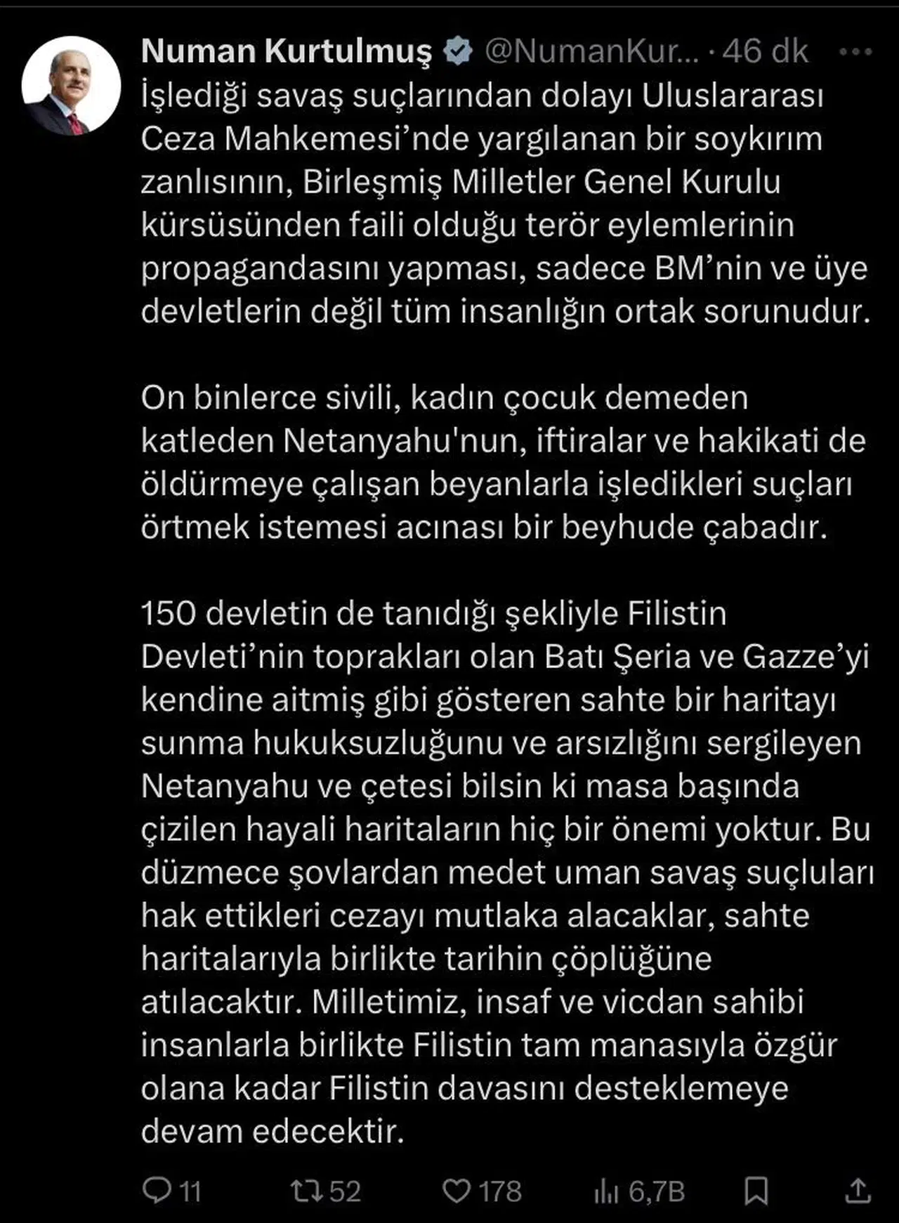 TBMM Başkanı Numan Kurtulmuş, sosyal medya hesabından yaptığı paylaşımda, “İşlediği savaş suçlarından dolayı Uluslararası Ceza Mahkemesi’nde yargılanan bir soykırım zanlısının, Birleşmiş Milletler Genel Kurulu kürsüsünden faili olduğu terör eylemlerinin propagandasını yapması, sadece BM’nin ve üye devletlerin değil tüm insanlığın ortak sorunudur. On binlerce sivili, kadın çocuk demeden katleden Netanyahu'nun, iftiralar ve hakikati de öldürmeye çalışan beyanlarla işledikleri suçları örtmek istemesi acınası bir beyhude çabadır. 150 devletin de tanıdığı şekliyle Filistin Devleti’nin toprakları olan Batı Şeria ve Gazze’yi kendine aitmiş gibi gösteren sahte bir haritayı sunma hukuksuzluğunu ve arsızlığını sergileyen Netanyahu ve çetesi bilsin ki masa başında çizilen hayali haritaların hiç bir önemi yoktur. Bu düzmece şovlardan medet uman savaş suçluları hak ettikleri cezayı mutlaka alacaklar, sahte haritalarıyla birlikte tarihin çöplüğüne atılacaktır. Milletimiz, insaf ve vicdan sahibi insanlarla birlikte Filistin tam manasıyla özgür olana kadar Filistin davasını desteklemeye devam edecektir” ifadelerini kullandı. (DHA)