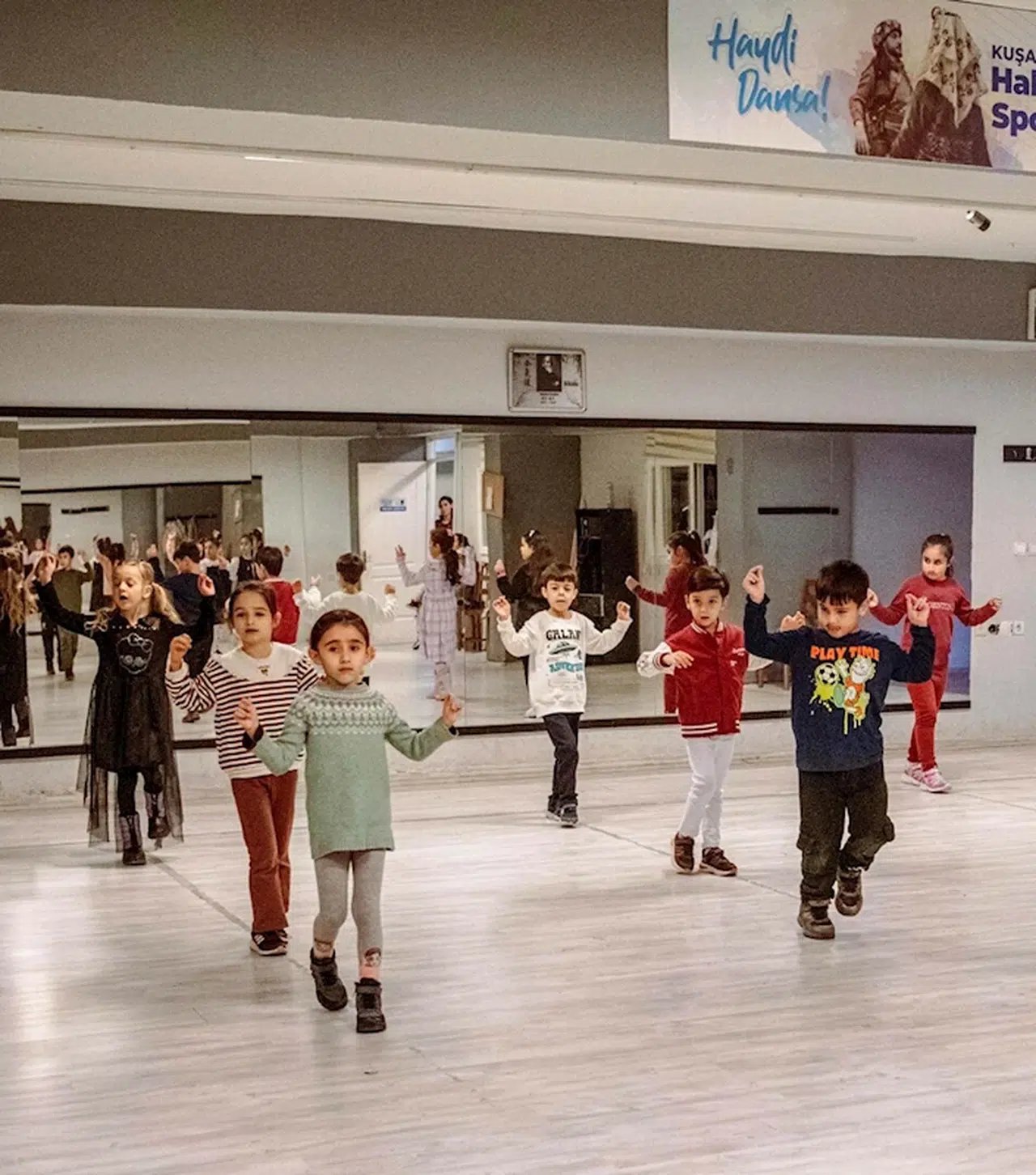 KUŞADASI (Aydın), (DHA)-AYDIN Kuşadası Belediyesi Halk Dansları Akademisi Spor Kulübü (KUŞADANS) tarafından ücretsiz olarak düzenlenen halk oyunları kursları, yeni yılda da yoğun ilgi görüyor. Ücretsiz olan kurslara katılan Kuşadalı çocuk, genç ve yetişkinler Türkiye'nin farklı yörelerine ait geleneksel kültürler ile tanışırken sosyalleşme imkanı da buluyor.