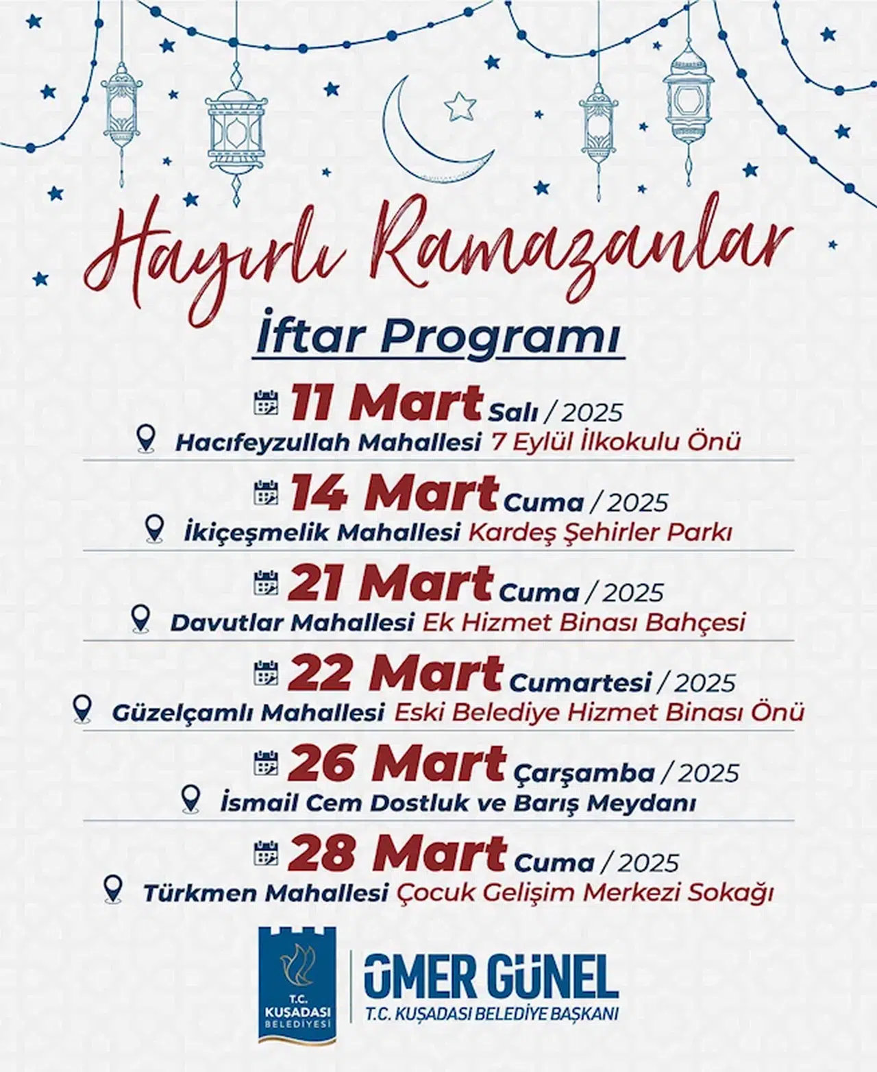 KUŞADASI (Aydın), (DHA)-KUŞADASI Belediyesi ramazan ayının bereketini ve dayanışma ruhunu ilçenin 6 farklı noktasında kuracağı iftar sofrasıyla büyütecek. Bu kapsamda Kuşadası'nda ilk iftar yemeği 11 Mart'ta Hacıfeyzullah Mahallesi'nde bulunan 7 Eylül İlkokulu önünde verilecek.