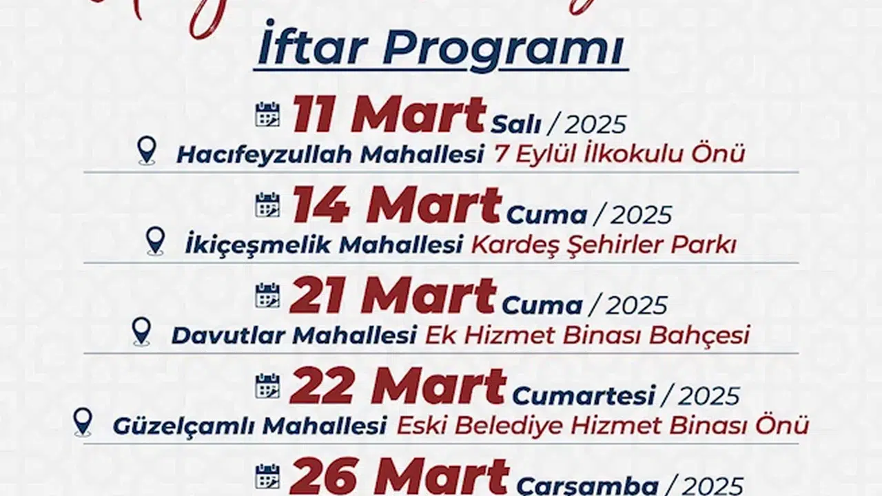 İftar programı, 14 Mart'ta İkiçeşmelik Mahallesi Kardeş Şehir Parkı, 21 Mart'ta Davutlar Mahallesi Ek Hizmet Binası bahçesi, 22 Mart'ta