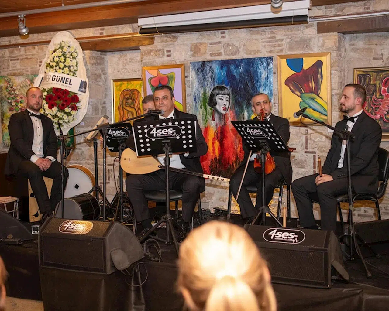 Kuşadası’nda yıl boyunca resim ve heykel gibi birçok sanat sergisine ev sahipliği yapan İbramaki Sanat Galerisi bu kez İzmir Devlet Klasik Türk Müziği Korosu sanatçılarını ağırladı. Kuşadası Belediyesi tarafından gerçekleştirilen etkinlikte sahneye çıkan Devlet Sanatçıları Uğur Top ile Atilla Irgız, Ersin Çalgıcılar, Şener Akıncı ve Hasan Kavallı'dan oluşan saz heyeti, Türkiye'nin farklı bölgelerine ait hem neşeli hem de duygu yüklü türküler seslendirdi. Konseri, çok sayıda davetli ile birlikte Kuşadası Belediye Başkan Yardımcısı Ayşegül Dağlı, Kuşadası Belediye Meclis Üyeleri, Başkan Ömer Günel’in eşi Duygu Günel, CHP Kuşadası İlçe Örgütü Kadın Kolları Başkanı Nilgün Yeşilçimen ve CHP Kuşadası İlçe Örgütü Gençlik Kolları Başkanı Tuğçe Ölkü de izledi. Yoğun ilginin olduğu gecenin sonunda devlet sanatçılarına Başkan Ömer Günel adına teşekkür plaketi verildi.(DHA)