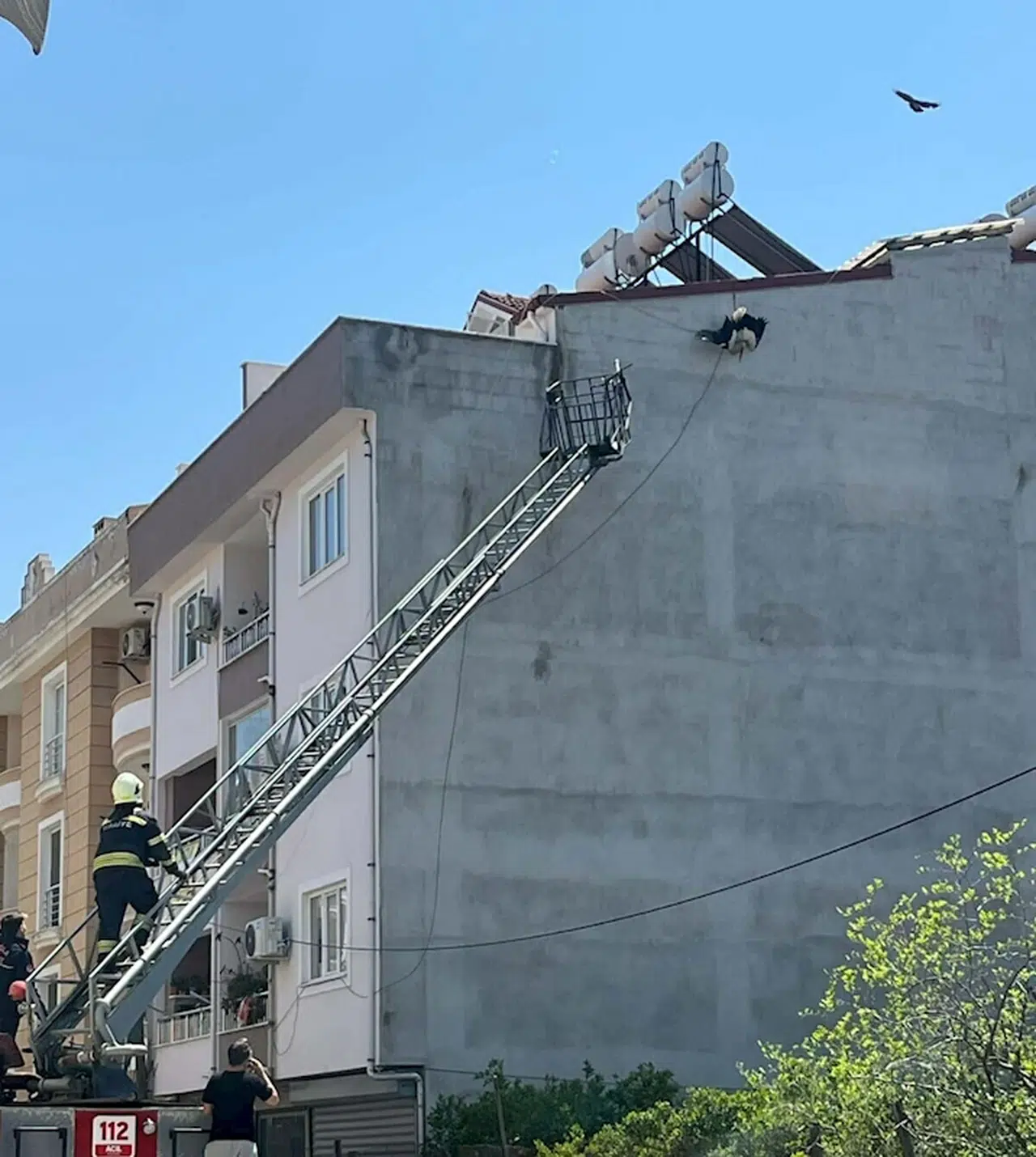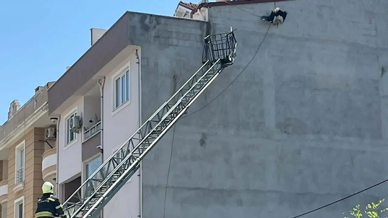 Cavit AKGÜN / MUĞLA, (DHA)-Muğla’nın Dalaman ilçesinde çatıda kabloya dolanan leylek itfaiye ekiplerince kurtarıldı