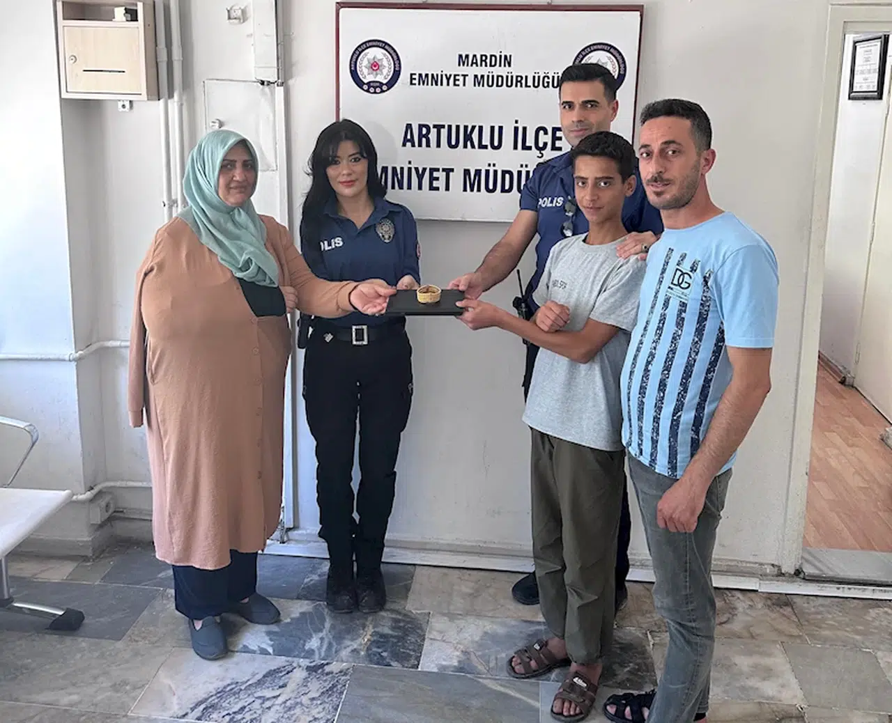 Salih KESKİN/MARDİN, (DHA)-MARDİN’de lise öğrencisi Hamza Hamo’nun yerde bularak polis merkezine götürdüğü 230 bin liralık altın bileklik, sahibine teslim edildi.