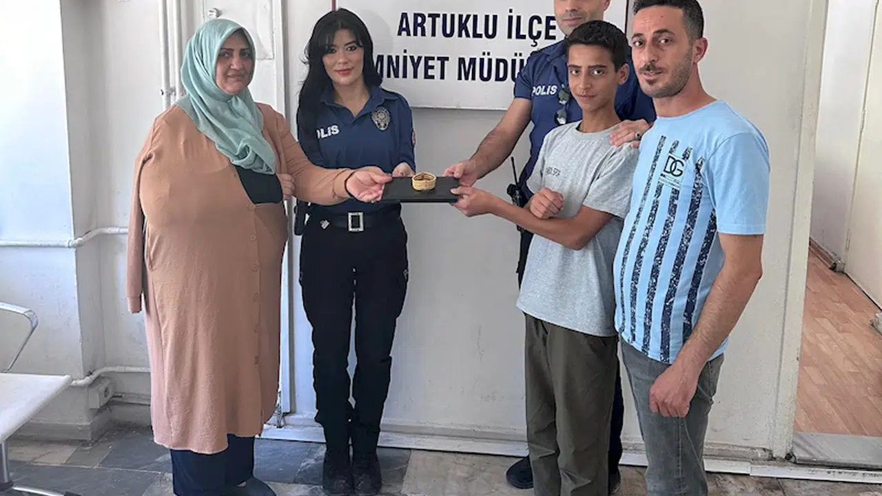 Merkez Artuklu ilçesinde 9’uncu sınıf öğrencisi Hamza Hamo, akşam saatlerine evine doğru yürüdüğü sırada, yerde altın bileklik buldu. Hamo, evine götürdüğü bilekliği ailesinin de yardımıyla Artuklu Polis Merkezi’ne ulaştırdı. Polis ekipleri, 230 bin lira değerinin bilekliğin sahibinin bulunması için çalışma başlattı. Çalışmada, bilekliğin sahibinin Merve Akbaş olduğu belirlendi. Polis merkezine gelen Akbaş, altın bilekliğini bulan lise öğrencisi ile bir araya geldi. Altın bilekliğini teslim alan Akbaş, Hamza Hamo’ya çeyrek altın hediye ederek, polis ekiplerine teşekkür etti.(DHA)