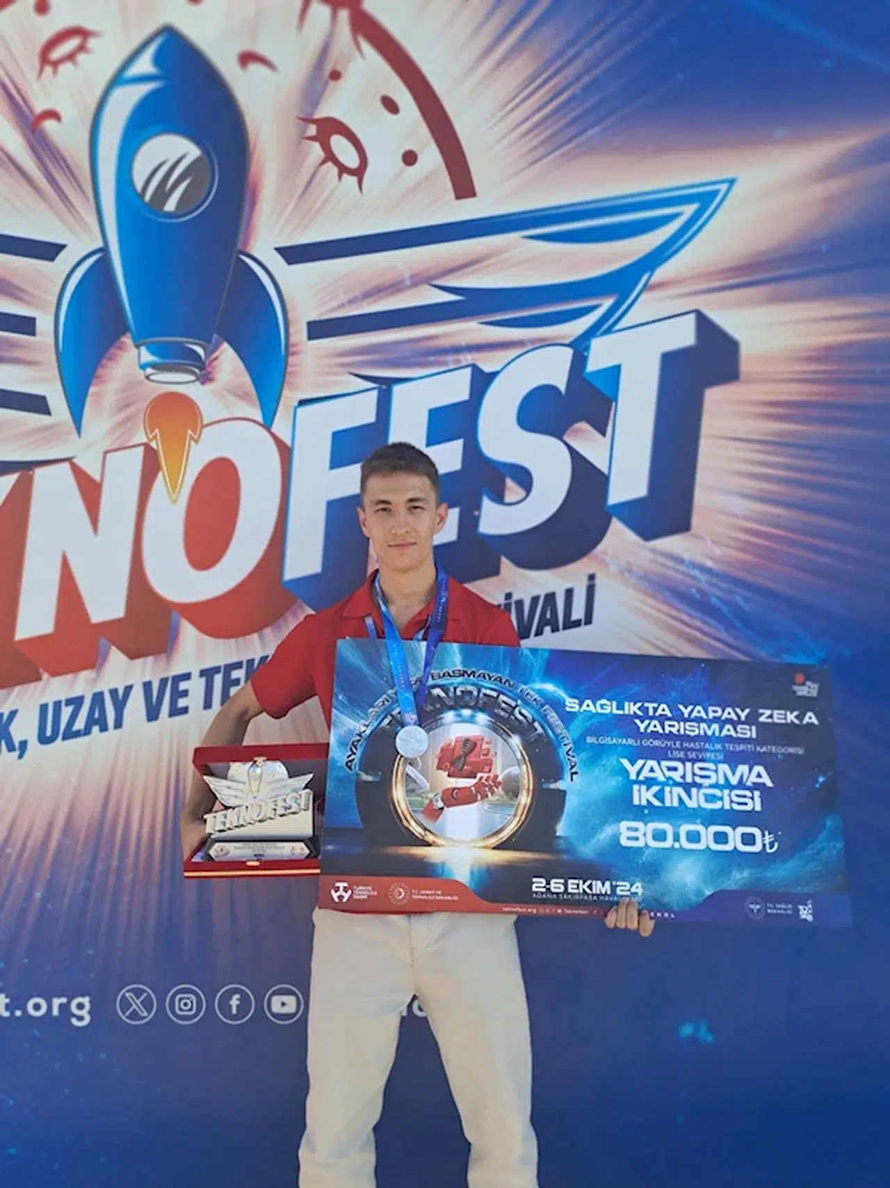 Mamografi görüntülerinden meme kanseri (BI-RADS) sınıflandırması ve kitle ile kalsifikasyon tespiti yapan yapay zeka modelleri geliştiren İzmir Atatürk Lisesi'nde 11'nci sınıf öğrencisi olan Ahmet Akay, dünya genelinde kadınlar arasında en sık görülen meme kanserinin ölümcül aşamaya geçmeden 2-4 yıl önce tespit edilmesine olanak sağladığı bir yazılım yaptı. Akay, yazılımı yaparken kendisine destek olan arkadaşlarıyla oluşturduğu İzmirli LayerLords takımıyla 5 bin 393 takım ve 11 bin 457 yarışmacının katıldığı 2024 Teknofest Sağlıkta Yapay Zeka Yarışması'na katıldı. Akay, Adana'da 2-6 Ekim tarihleri arasında yapılan yarışmada Türkiye 2'ncisi oldu. Ödülü almaktan büyük mutluluk duygunu belirten Ahmet Akay, “Ortaokuldan bu yana yazılım ve yapay zeka alanlarına ilgi duyuyorum ve bu konularda kendimi geliştirmeye çalışıyorum. Anne ve babamın doktor olması nedeniyle hastane ortamında birçok kez bulundum. Bu süreçte, kanserle mücadele eden hastaların yaşadığı acı tecrübeleri yakından görme fırsatım oldu. Bu deneyimler, sağlık alanındaki sorunlara duyarlılığımı arttırdı" dedi.