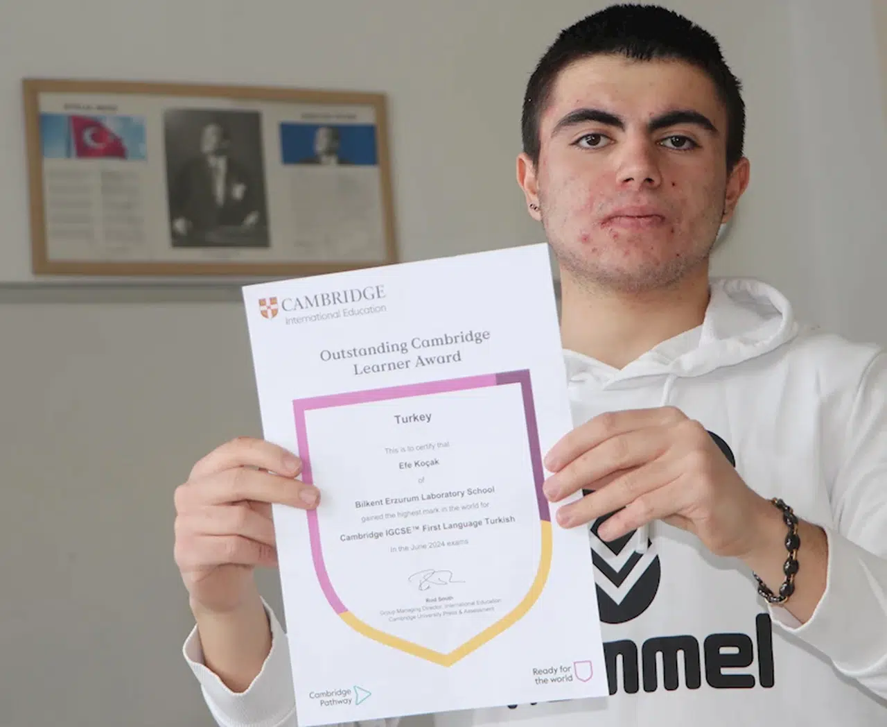 Efe Koçak'ın Türkçe öğretmeni Diba Akın, "Bu prestijli ödül, dünya genelinde 150'den fazla ülkede uygulanmakta ve dünya çapında yaklaşık 6 bin okulda okutulmakta olan IGCSE programına katılan binlerce öğrenci arasında alanında en yüksek başarıyı gösteren öğrencilere verilmektedir. IGCSE sınavları, öğrencilerin akademik bilgi ve becerilerini uluslararası düzeyde değerlendiren, eleştirel düşünme, araştırma ve analiz yeteneklerini geliştirmeyi hedefleyen saygın bir programdır. Efe Koçak'ın bu büyük başarıya ulaşmasında görev ve sorumluluk bilinciyle hareket etmesi, öğretmenlerinin rehberliğini dikkatle takip etmesi büyük rol oynamıştır. Akademik disiplini ve azmi sayesinde dünya çapında elde ettiği bu başarı, sadece bireysel bir kazanım değil; aynı zamanda Bilkent Erzurum Laboratuvar Okulları'nın eğitim kalitesinin de bir göstergesidir" diye konuştu.