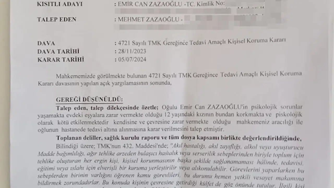 Bingöl’de 2 kişinin öldüğü, 7 kişinin de yaralandığı bıçaklı saldırı olayının şüphelisinin, Emir Can Zazaoğlu olduğu öğrenildi. Şüphelinin babası Mehmet Zazaoğlu’nun 28/11/2023’te Bingöl Sulh Hukuk Mahkemesi’ne oğlunun psikolojik sorunlarının olduğunu, evdeki eşyalara, kendisine ve çevresindekilere zarar verdiğini, 12 yaşındaki kız kardeşinin de ağabeyinin bu durumundan korkarak kötü etkilendiğini belirterek, Elazığ Ruh ve Sinir Hastalıkları Hastanesi’nde gözlem altında tutularak, tedavi edilmesi için başvuruda bulunduğu ortaya çıktı. Mahkeme de bu talebin değerlendirilmesi için Emir Can Zazaoğlu’nu Elazığ Ruh ve Sinir Hastalıkları Hastanesi’ne sevk etti. Hastane tarafından 4 Temmuz’da düzenlenen raporda Emir Can Zazaoğlu ile ilgili, ‘Şahsın halihazır durumu ile yapılan psikiyatrik muayenesinde Türk Medeni Kanunu’nun 432’nci maddesi gereğince yatarak tedavisinin gerekli olmadığını bildirir sağlık kurulu raporu oy birliği ile verildi’ şeklindeki görüş belirtildi. 5 Temmuz’da davanın görülen karar duruşmasında mahkeme rapora istinaden, Emir Can Zazaoğlu’nun ‘Tedavi amacıyla özgürlüğünün kısıtlanmasına yer olmadığına’ karar verdi. Emir Can Zazaoğlu’nun emniyetteki işlemleri devam ediyor. (DHA)