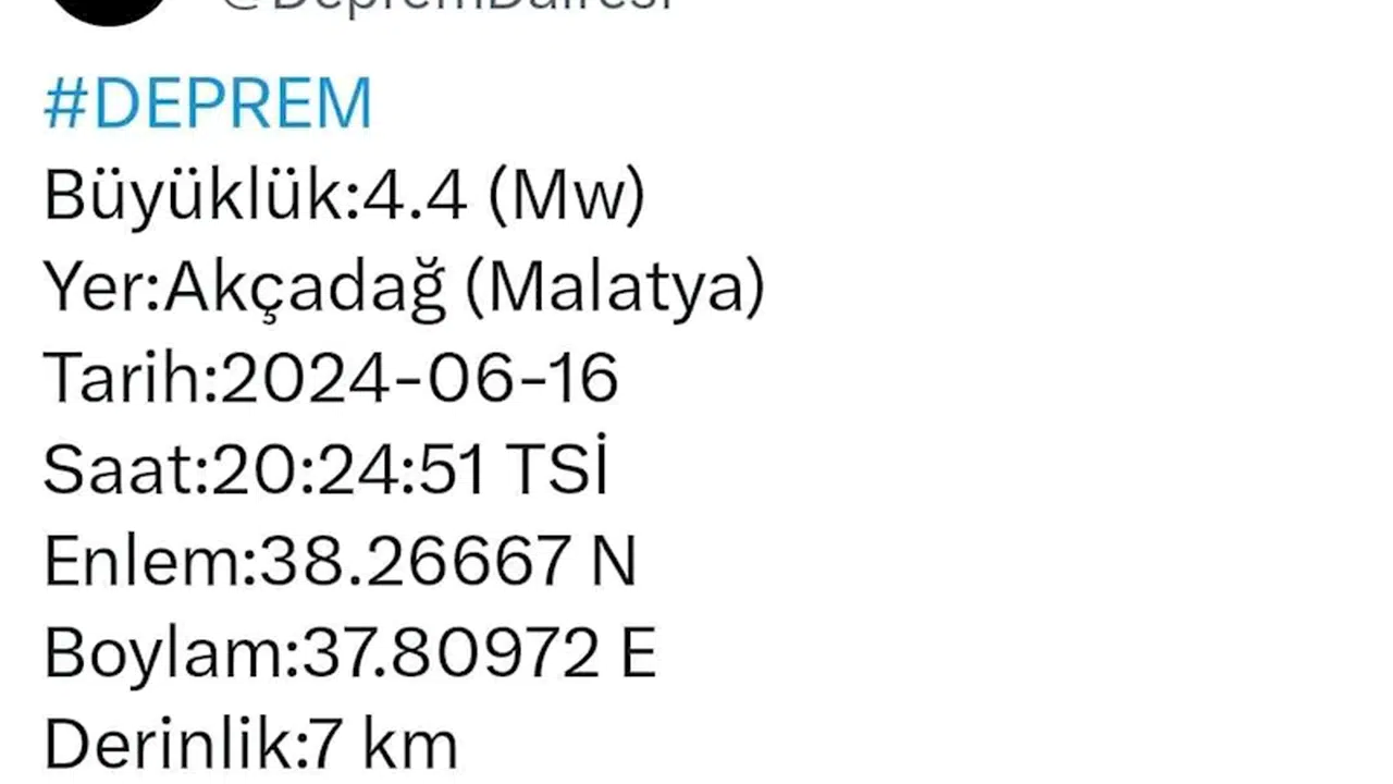 Recep BAĞDAT/ MALATYA, (DHA)- MALATYA'nın Akçadağ ilçesinde Richter ölçeğine göre 4.4 büyüklüğünde deprem meydana geldi.