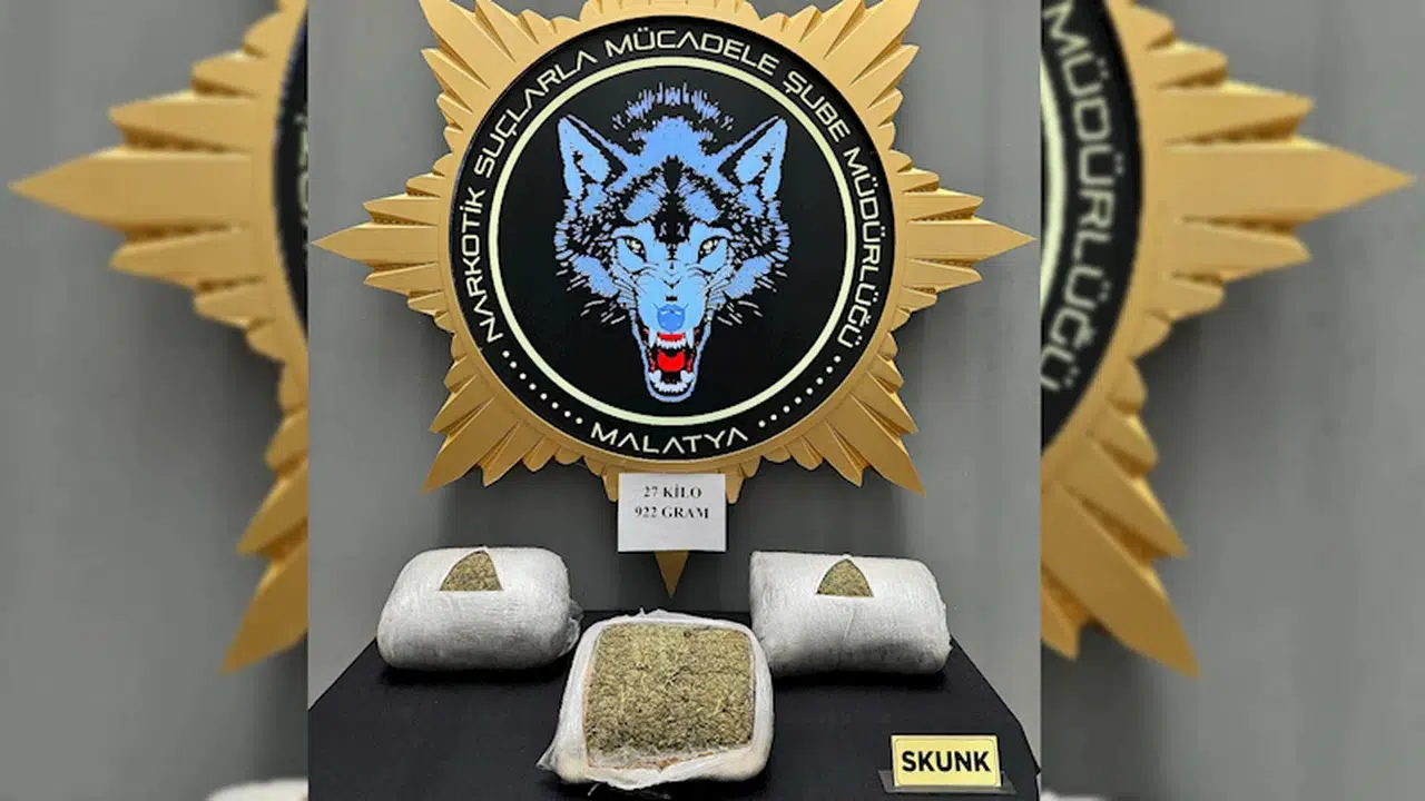 Malatya İl Emniyet Müdürlüğü Narkotik Suçlarla Mücadele Şube Müdürlüğü ekipleri tarafından gece saatlerinde Kale ilçesi girişinde yolcu otobüsü şüphe üzerine durduruldu. Otobüste, narkotik köpeği ile arama yapıldı. Bagajda 3 parça halinde 27 kilo 922 gram skunk ele geçirildi. Gözaltına alınan ve emniyetteki işlemlerinin ardından adliyeye sevk edilen A.K., tutuklandı. (DHA)