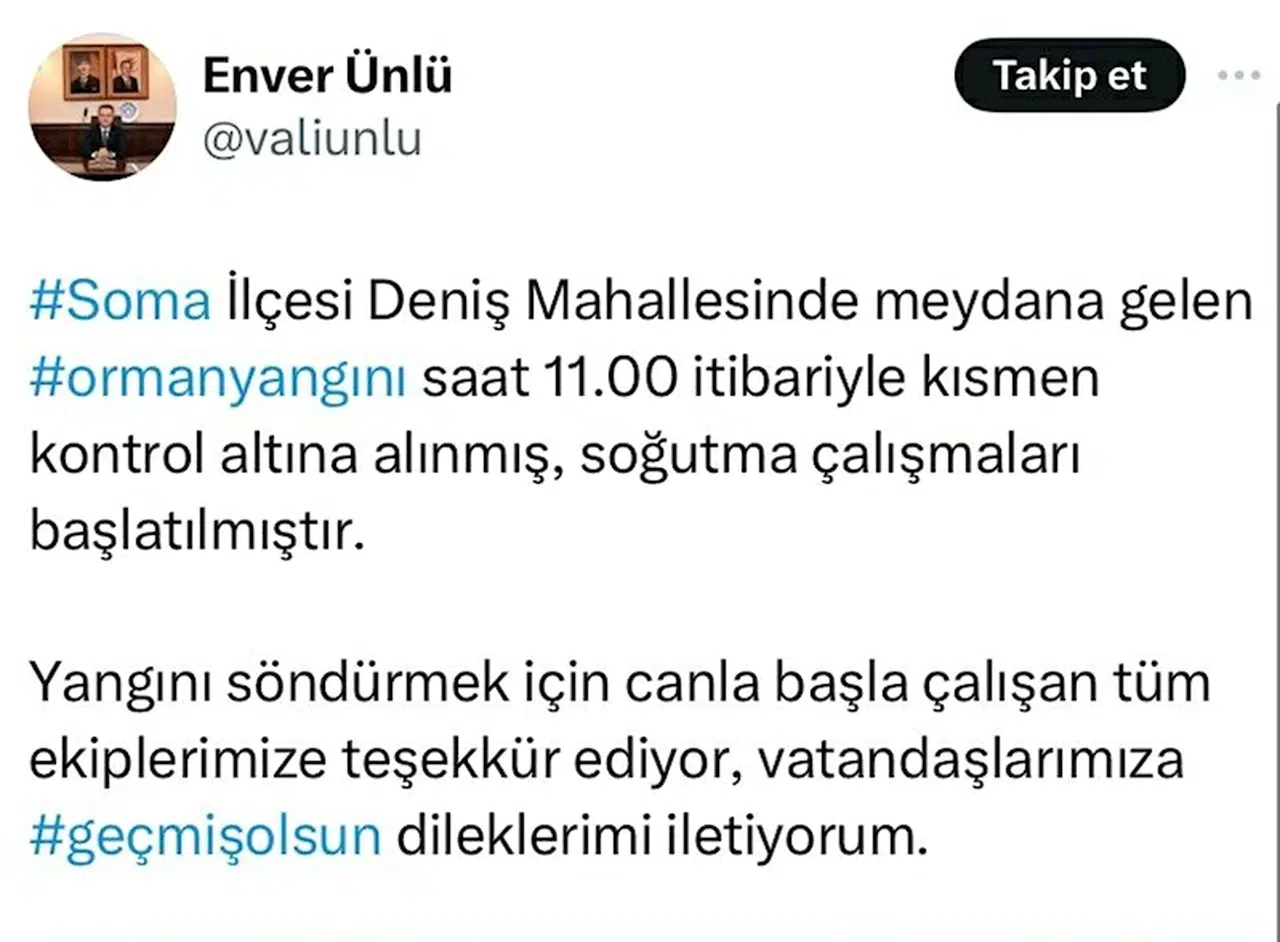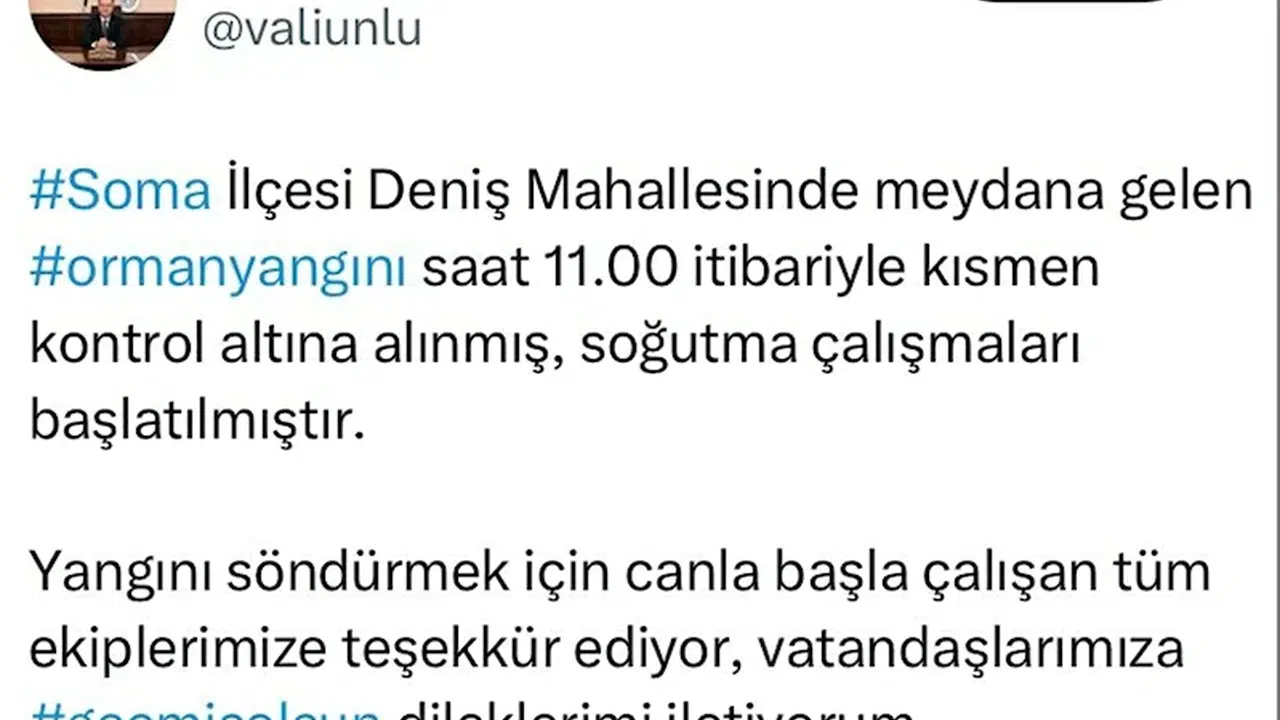"Soma İlçesi Deniş Mahallesi'nde meydana gelen orman yangını saat 11.00 itibariyle kısmen kontrol altına alınmış, soğutma çalışmaları başlatılmıştır. Yangını söndürmek için canla başla çalışan tüm ekiplerimize teşekkür ediyor, vatandaşlarımıza geçmiş olsun dileklerimi iletiyorum."