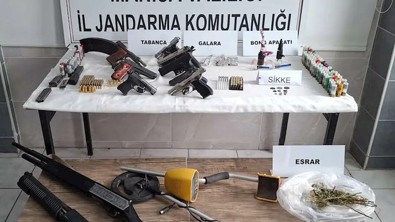 Manisa İl Jandarma Komutanlığı Kaçakçılık ve Organiza Suçlarla Mücadele Şubesi, Jandarma Suç Araştırma Timi (JASAT) ile Turgutlu ve Salihli ilçe jandarma komutanlıkları ekipleri tarafından, bugün sabah saatlerinde uyuşturucu madde imalatı, silah ve diğer kaçakçılık suçlarına yönelik operasyon düzenlendi. Yapılan çalışma kapsamında 44 şüpheliye yönelik 41 ayrı adrese eş zamanlı operasyon düzenlendi. Yapılan aramalarda ruhsatsız 11'i kurusıkı 21 tabanca, 33 tüfek, 2 şarjör, 298 tabanca fişeği, 222 tüfek kartuşu, 133 kurusıkı tabanca fişeği, 8 bıçak, 160 gram kubar esrar, 3 gram metamfetamin, 6 adet sentetik ecza hap, 5 kök kenevir, 2 hassas terazi, 2 esrar öğütme aparatı, 19 uyuşturucu madde kullanma aparatı, 1 dedektör ve 11 adet sikke ele geçirildi.