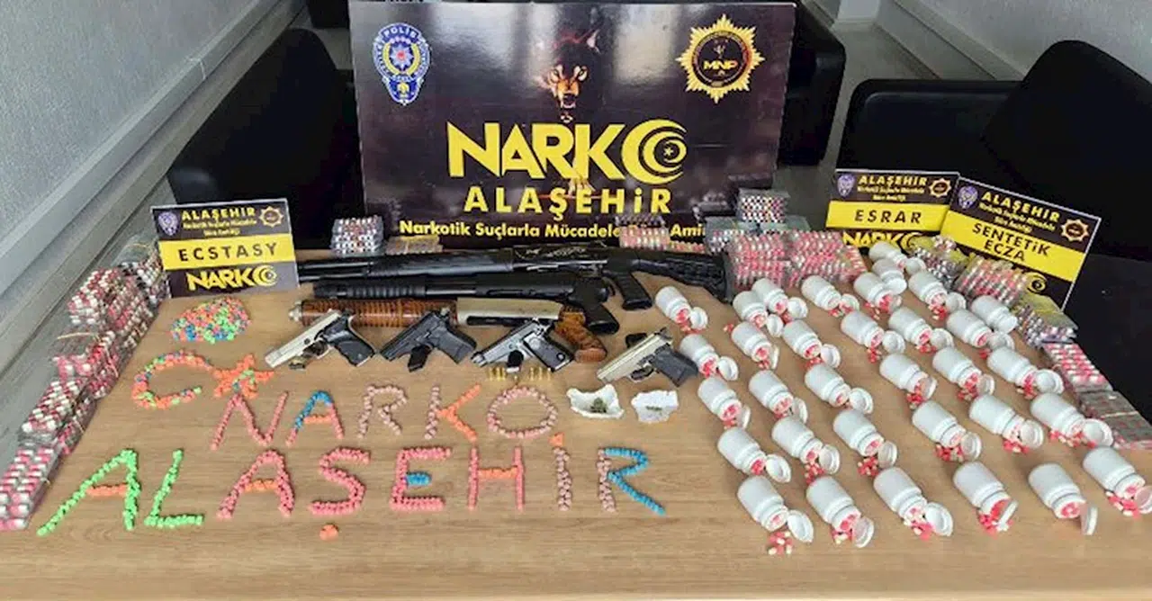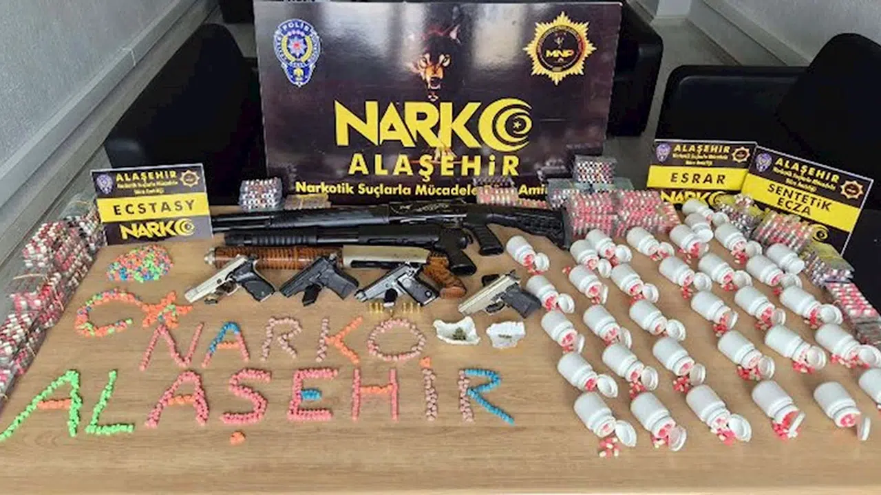 Alaşehir İlçe Emniyet Müdürlüğü Narkotik Suçlarla Mücadele Büro Amirliği ekipleri, uyuşturucu ve uyarıcı madde satan şüphelilere yönelik, Yeni Mahalle ve Menderes mahallelerinde, dün, operasyon düzenledi. Her iki mahalledeki toplam 5 ayrı adrese eş zamanlı yapılan baskınlarda 4 bin 333 adet sentetik ecza hapı, 900 adet ecstasy uyuşturucu hap, 2.97 gram esrar, ruhsatsız 4 tabanca, 3 pompalı tüfek ele geçirildi. Şüpheliler C.Ç.(27) ve S.Y. (25) gözaltına alındı. Polisteki işlemlerini ardından adliyeye sevk edilen 2 şüpheli, çıkarıldıkları mahkemece tutuklandı.(DHA)