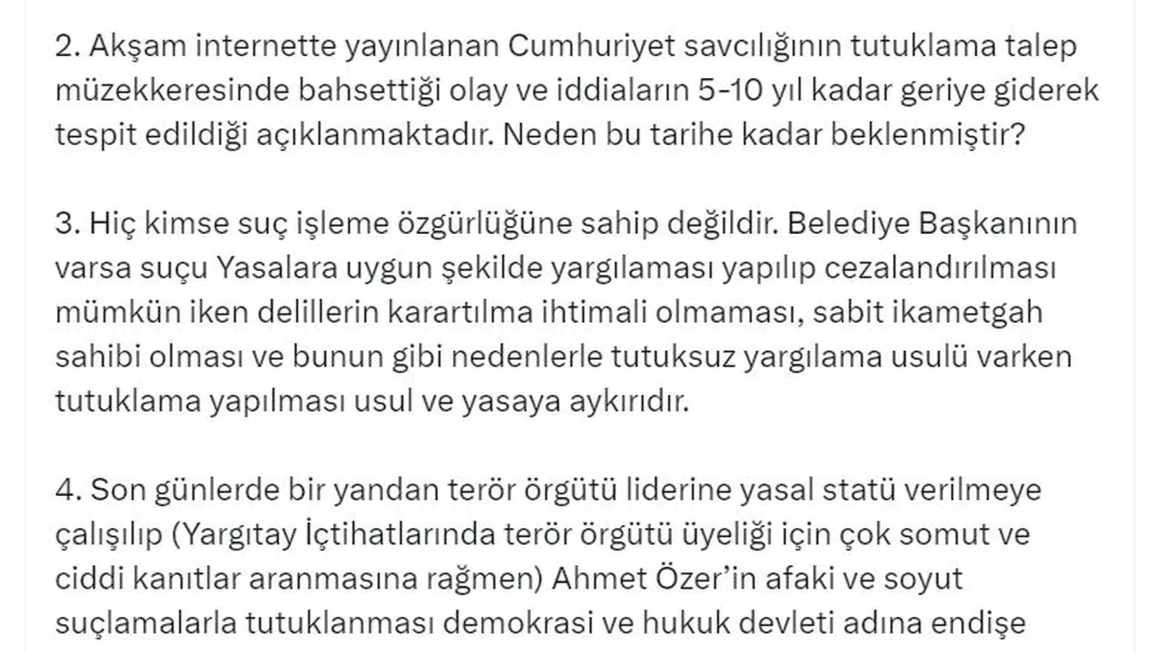 Başkan Yavaş, sosyal medya hesabından yaptığı açıklamada, "Öncelikle seçilmiş bir belediye başkanının davetle çağrı mümkün iken sabahın 05.30'unda evinin basılarak gözaltına alınması hukuka uygun değildir. Sadece itibarsızlaştırmak istendiğinin bir göstergesidir. Akşam internette yayınlanan Cumhuriyet savcılığının tutuklama talep müzekkeresinde bahsettiği olay ve iddiaların 5-10 yıl kadar geriye giderek tespit edildiği açıklanmaktadır. Neden bu tarihe kadar beklenmiştir? Hiç kimse suç işleme özgürlüğüne sahip değildir. Belediye Başkanının varsa suçu yasalara uygun şekilde yargılaması yapılıp cezalandırılması mümkün iken delillerin karartılma ihtimali olmaması, sabit ikametgah sahibi olması ve bunun gibi nedenlerle tutuksuz yargılama usulü varken tutuklama yapılması usul ve yasaya aykırıdır. Son günlerde bir yandan terör örgütü liderine yasal statü verilmeye çalışılıp (Yargıtay içtihatlarında terör örgütü üyeliği için çok somut ve ciddi kanıtlar aranmasına rağmen) Ahmet Özer’in afaki ve soyut suçlamalarla tutuklanması demokrasi ve hukuk devleti adına endişe vericidir. Henüz tutuklama yapılmadan soruşturma esnasında bazı internet sitelerinde Esenyurt Belediyesine kayyum atanacağı iddiaları ve bu iddianın gerçekleşmiş olması, işin siyasi boyutunun inkar edilemez bir hal aldığını göstermektedir" ifadelerini kullandı. (DHA)