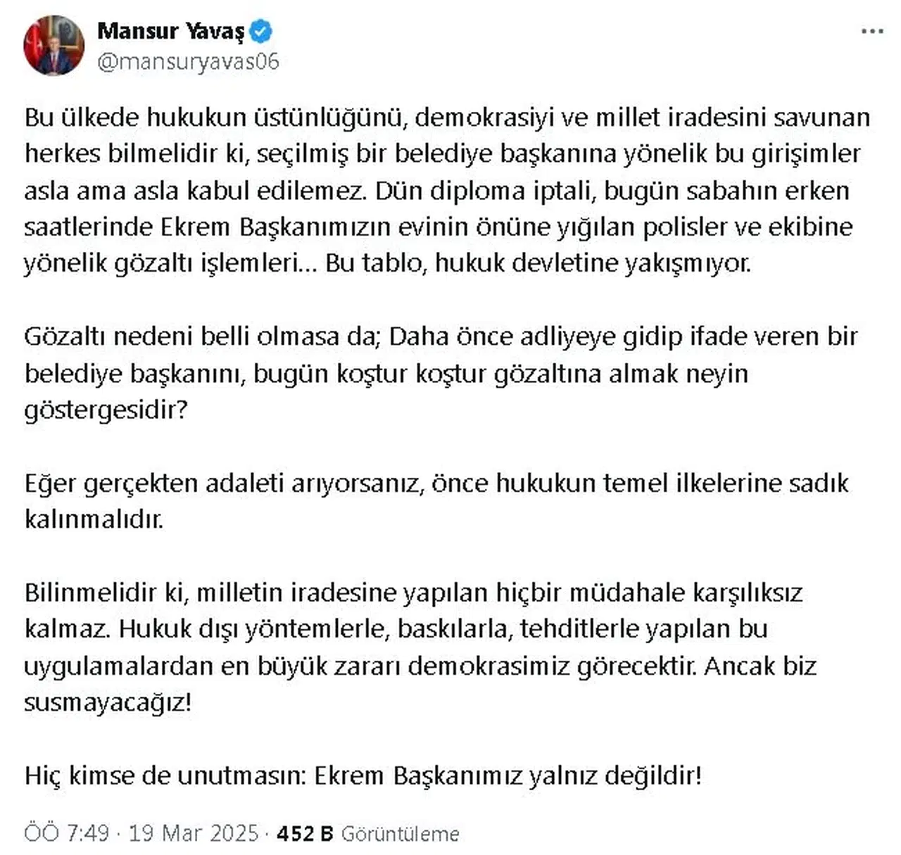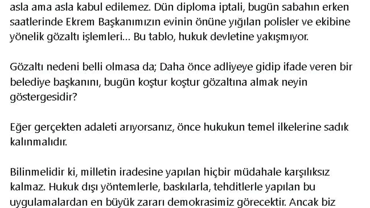 Ankara Büyükşehir Belediye Başkanı Mansur Yavaş, İstanbul Büyükşehir Belediye Başkanı Ekrem İmamoğlu'nun gözaltına alınmasına ilişkin sosyal medya hesabından yaptığı açıklamada, "Bu ülkede hukukun üstünlüğünü, demokrasiyi ve millet iradesini savunan herkes bilmelidir ki seçilmiş bir belediye başkanına yönelik bu girişimler asla ama asla kabul edilemez. Dün diploma iptali, bugün sabahın erken saatlerinde Ekrem Başkanımızın evinin önüne yığılan polisler ve ekibine yönelik gözaltı işlemleri. Bu tablo, hukuk devletine yakışmıyor. Gözaltı nedeni belli olmasa da daha önce adliyeye gidip ifade veren bir belediye başkanını, bugün koştur koştur gözaltına almak neyin göstergesidir. Eğer gerçekten adaleti arıyorsanız, önce hukukun temel ilkelerine sadık kalınmalıdır. Bilinmelidir ki milletin iradesine yapılan hiçbir müdahale karşılıksız kalmaz. Hukuk dışı yöntemlerle, baskılarla, tehditlerle yapılan bu uygulamalardan en büyük zararı demokrasimiz görecektir. Ancak biz susmayacağız. Hiç kimse de unutmasın; Ekrem Başkanımız yalnız değildir" ifadelerini kullandı. (DHA)