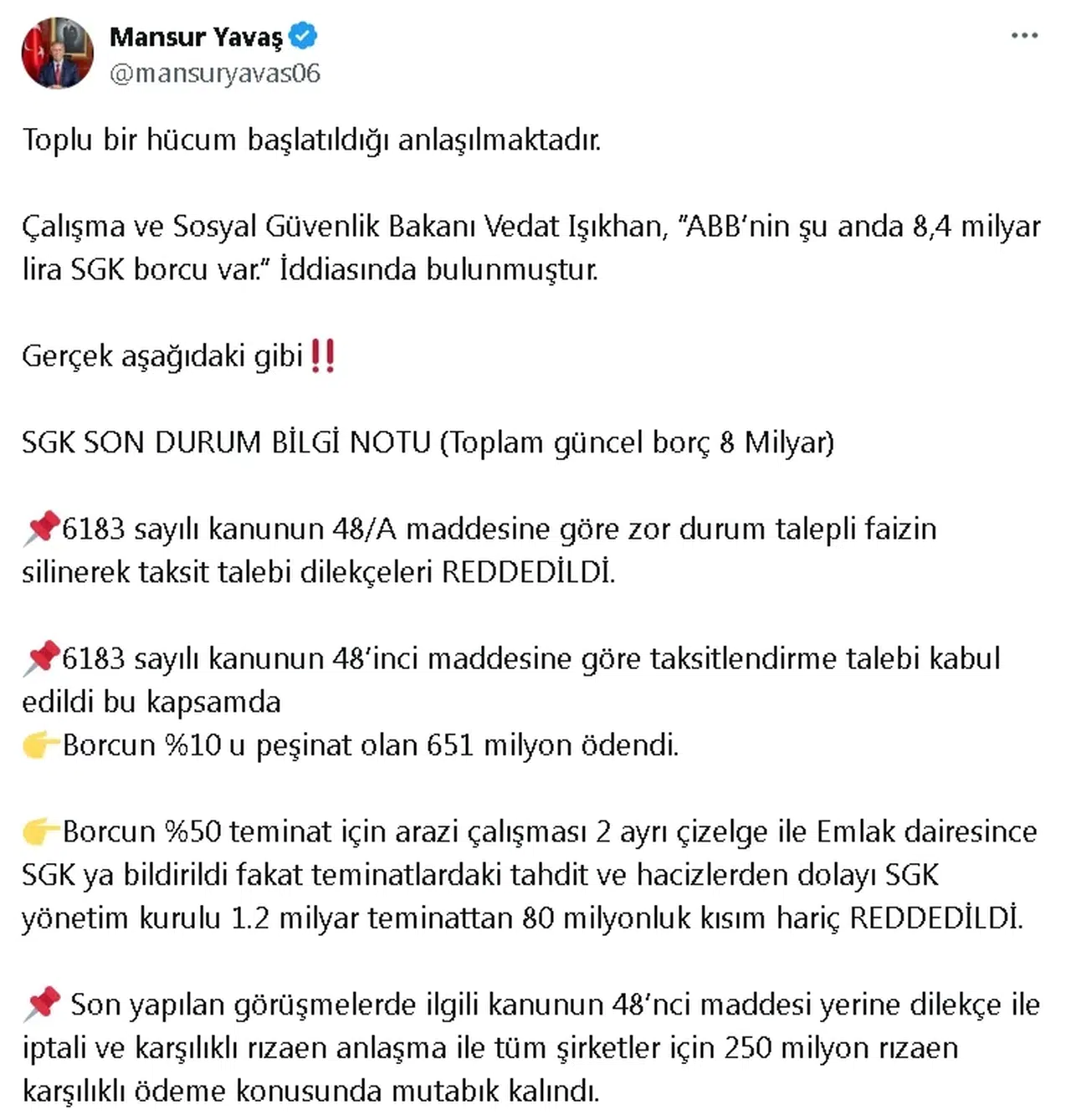 ANKARA, (DHA)- ANKARA Büyükşehir Belediye Başkanı Mansur Yavaş, "Toplu bir hücum başlatıldığı anlaşılmaktadır. Çalışma ve Sosyal Güvenlik Bakanı Vedat Işıkhan, 'ABB’nin şu anda 8,4 milyar lira SGK borcu var' iddiasında bulunmuştur. 6183 sayılı Kanun'un 48/A maddesine göre zor durum talepli faizin silinerek taksit talebi dilekçeleri reddedildi" dedi.