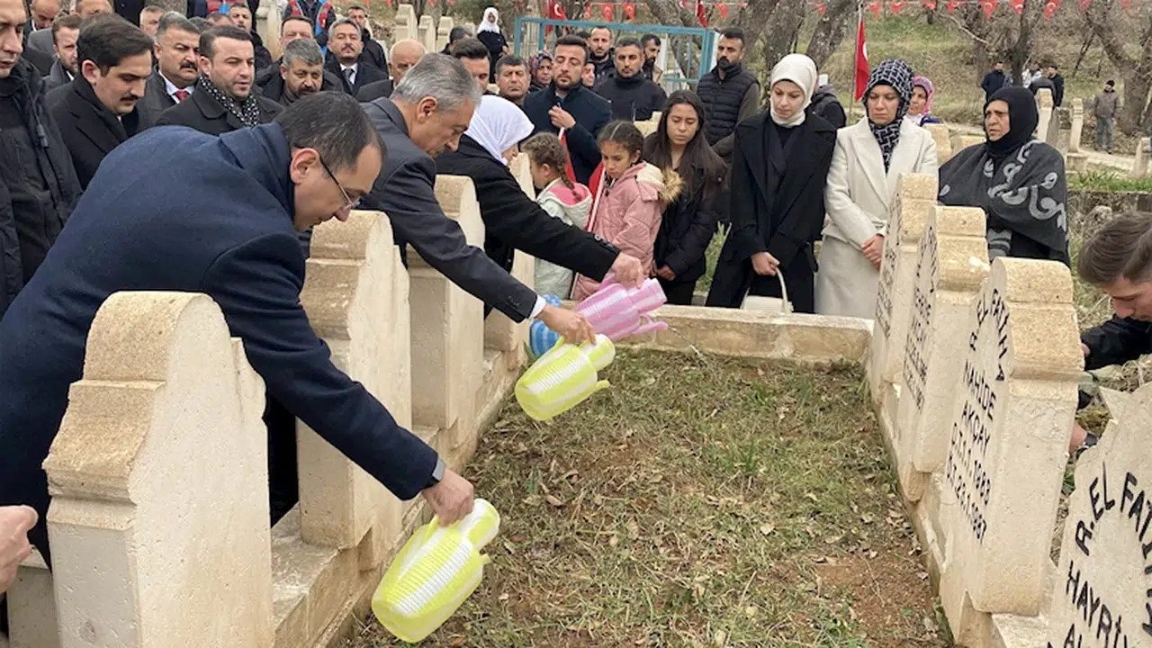 Törende konuşan Vali Tuncay Akkoyun, 10 kişiden 7'sinin çocuk yaşta olduğunu ifade ederek, "1987 yılında terör örgütü mensubu teröristler tarafından 10 vatandaşımız alçakça bir saldırı sonucunda şehit edilmiştir. Bugünün yıl dönümü nedeniyle, 23 Ocak olması münasebetiyle, ailemizle, burada yaşayan vatandaşlarımızla, kamu kurumlarımızdaki çalışma arkadaşlarımızla, şehitlerimizin kabirlerini ziyaret ettik, dualarımızı okuduk, ailemizi ziyaret ettik. Rabbim şehitlerimize rahmet eylesin, mekanları cennettir, makamları ali olsun inşallah. 23 Ocak 1987 yılında 10 şehidimiz ki; bu 10 şehidimizin 7'si çocuk, 10 şehidimizden sonra da toplam 30 şehit verilmiş mahallemizde" dedi.