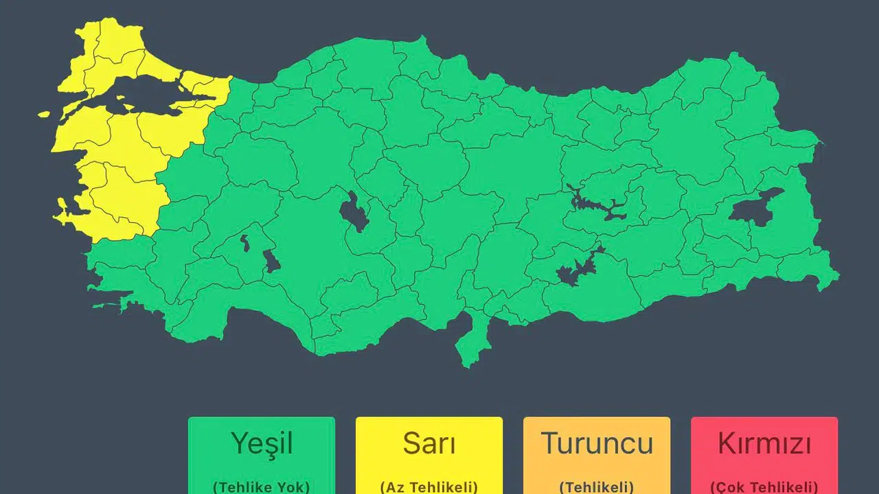 İÇİŞLERİ Bakanlığı, 26-27 Eylül'de Marmara ve Ege Bölgesi'ndeki 11 ilde kuvvetli rüzgar ve fırtına beklendiğini duyurarak çatı uçması ve ağaç devrilmesi gibi olaylara karşı uyarıda bulundu.
