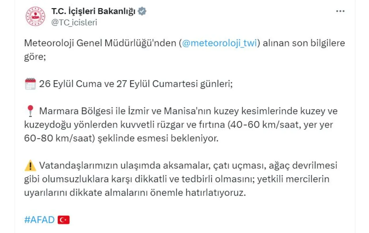 Bakanlığın sosyal medya hesabından yapılan açıklamada, "Meteoroloji Genel Müdürlüğü'nden alınan son bilgilere göre; 26 Eylül Cuma ve 27 Eylül Cumartesi günleri; Marmara Bölgesi ile İzmir ve Manisa'nın kuzey kesimlerinde kuzey ve kuzeydoğu yönlerden kuvvetli rüzgar ve fırtına (40-60 km/saat, yer yer 60-80 km/saat) şeklinde esmesi bekleniyor. Vatandaşlarımızın ulaşımda aksamalar, çatı uçması, ağaç devrilmesi gibi olumsuzluklara karşı dikkatli ve tedbirli olmasını; yetkili mercilerin uyarılarını dikkate almalarını önemle hatırlatıyoruz" denildi.