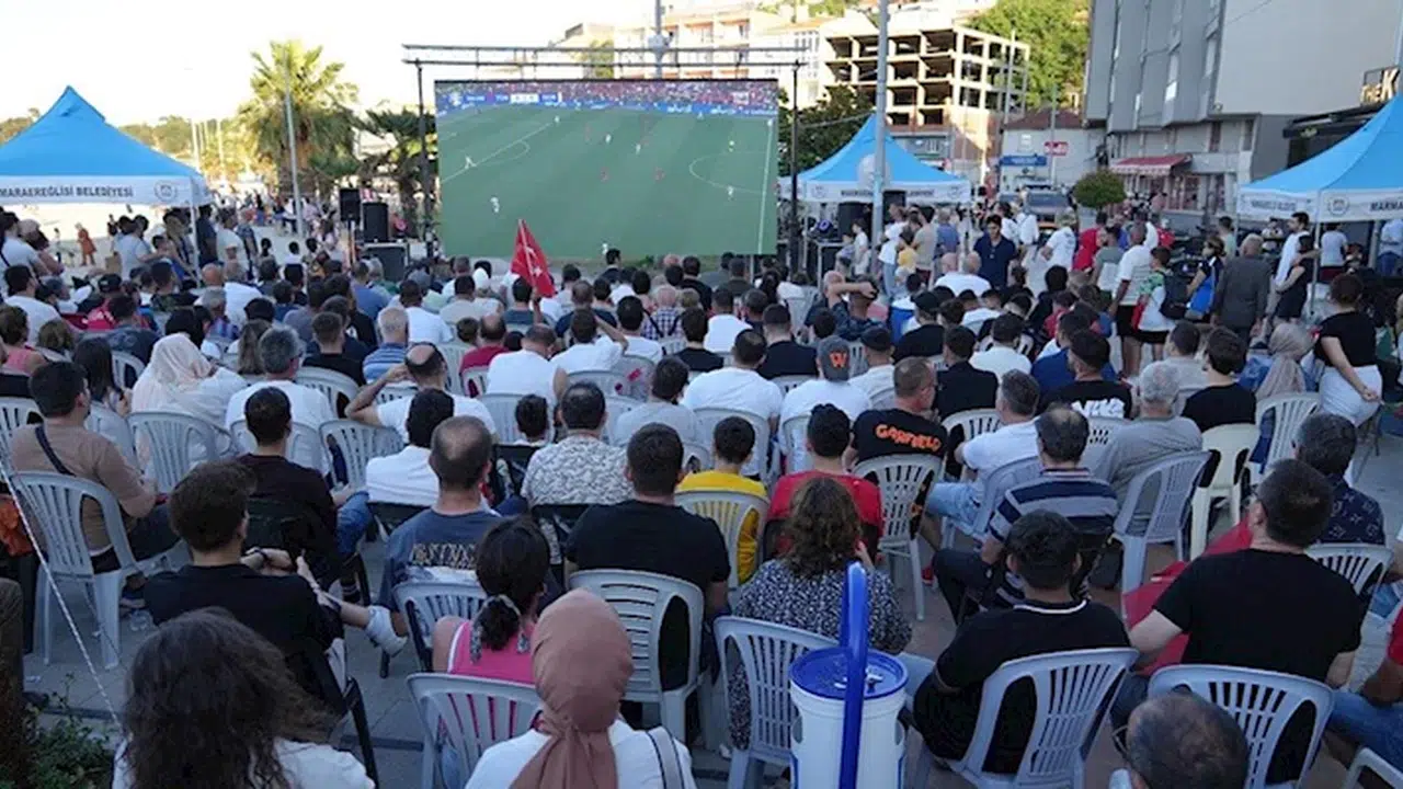 Ellerinde Türk bayraklarıyla karşılaşmayı izleyenler büyük heyecan yaşadı. Türkiye’nin maçı 3-1 kazanmasının ardından da sahilde büyük sevinç yaşandı. Maçı vatandaşlarla birlikte izleyen başkan Mustafa Onur Bozkurter da, sevince ortak oldu. (DHA)