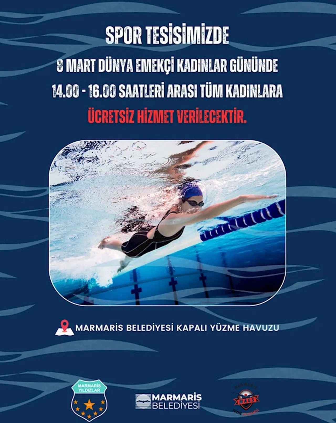 Öte yandan 8 Mart Dünya Emekçi Kadınlar Günü dolayısıyla belediyenin yüzme havuzu 14.00-16.00 saatleri arasında yüzme bilen kadınlara ücretsiz olarak açık olacak. Marmaris Yıldızları Gençlik ve Spor Kulübü ile Marmaris Akademi Gençlik ve Spor Kulübü işbirliğiyle yapılacak etkinlikte iki kulübün hocaları da yer alacak. Etkinliklere tüm kadınları davet eden Marmaris Belediye Başkanı Acar Ünlü, "8 Mart gibi kadın mücadelesinin simgesi olan bir günü hep birlikte dayanışmayla kutlamak ve farkındalığı daha da arttırmak için herkesi etkinliklerimize bekliyoruz"