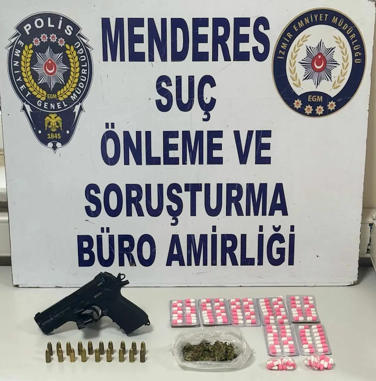 Menderes Suç Önleme ve Soruşturma Büro Amirliği, uyuşturucu madde ticareti yapan 8 şüpheli tespit etti. Cüneytbey Mahallesi'nin bugün iki ayrı sokağında yapılan operasyonlarda; toplamda 13 gram esrar, 124 sentetik hap, 6 extacy hap, 1 hassas terazi, 345 gram metamfetamin, 1 ruhsatsız tabanca, 19 dolu tabanca fişeği ve suçtan elde edildiği belirlenen 2 bin 600 TL ele geçirildi. Yakalanan 8 şüphelinin emniyetteki işlemlerinin ardından, adliyeye sevk edileceği öğrenildi. (DHA)