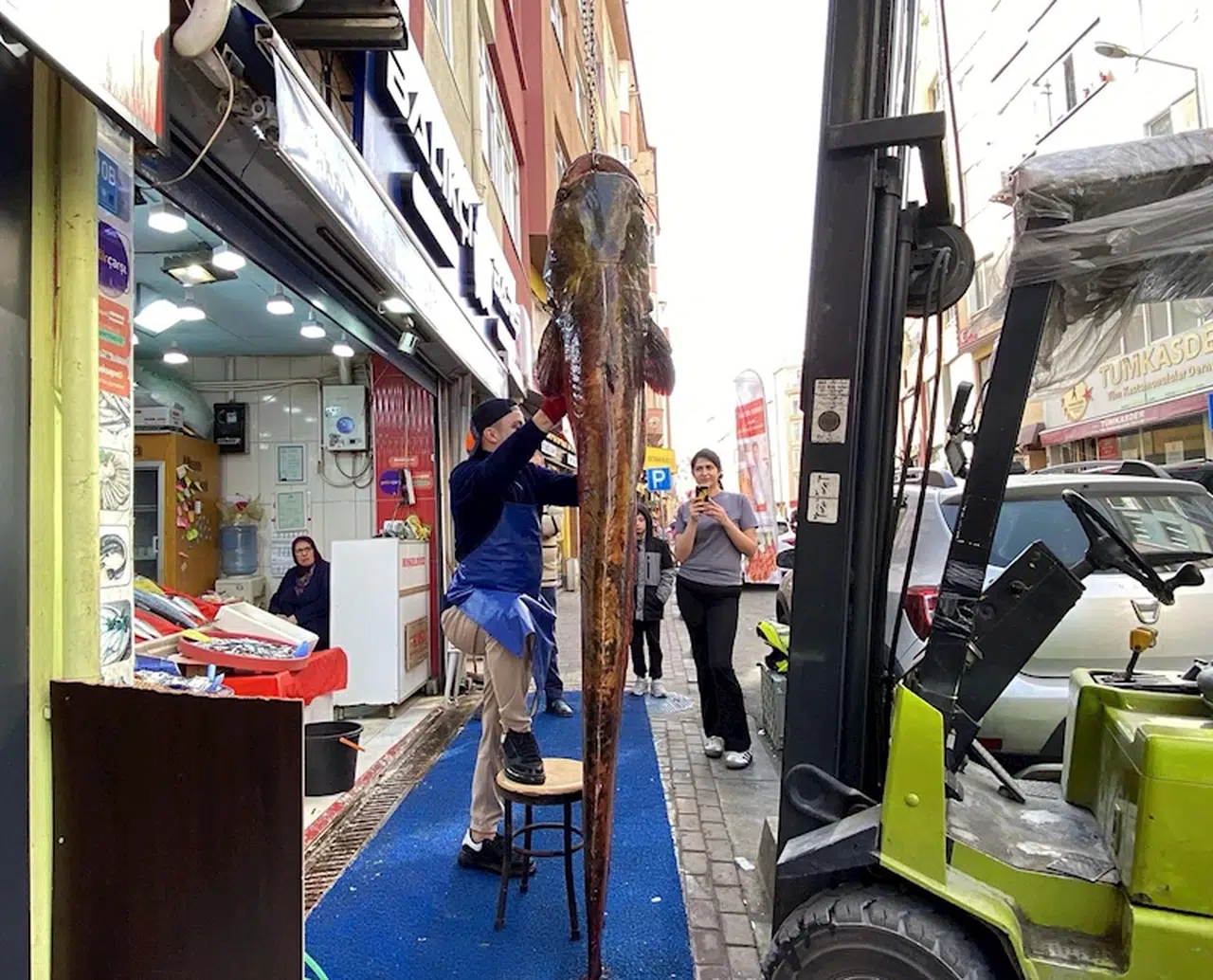 Çorlu’da balıkçılık yapan Barış Bayırlı, Meriç Nehri’nde yakalanan 3 metre boyunda, 150 kilo ağırlığındaki yayın balığını satın alıp, tezgahında sergilemeye başladı. Forkliftin ucuna asılıp sergilenen balığı görenler, fotoğraf çektirdi.
