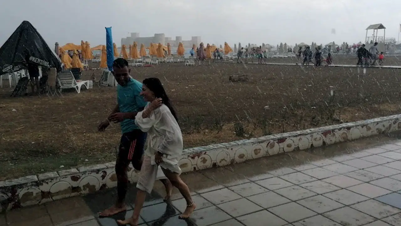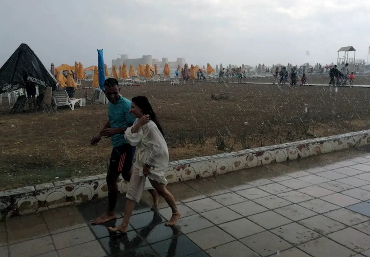 Mersin’de yüksek kesimlerde etkili olan sağanak yağmur sahilde de etkili olunca tatilciler kötü sürprizle karşılaştı. Erdemli ilçesinde yer alan Kızkalesi tatil beldesine serinlemek için gelen tatilciler, yağmurun bastırması ile sahili boşalttı. Yağmurdan kaçanlar çevrede bulunan mekanlara sığındı. Bazı tatilciler ise yağmura aldırış etmeden denize girmeye ve yüzmeye devam etti. (DHA)