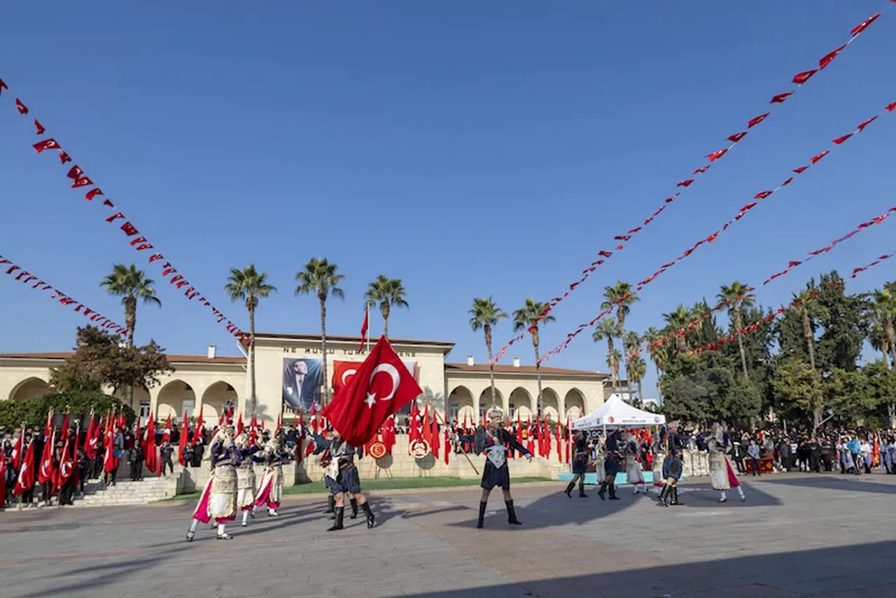 Cumhuriyet Meydanı'nda Vali Pehlivan, Tuğamiral Eser ve Başkan Seçer'in, Atatürk Anıtı'na çelenk sunumuyla başlayan tören, saygı duruşu ve İstiklal Marşı'nın okunmasıyla sürdü. Vali Pehlivan, Tuğamiral Eser ve Başkan Seçer, cipe binerek kutlamalara katılanları tebrik etti. Törende öğrenciler şiirler okudu, Büyükşehir Belediyesi halk oyunları ekibi gösteri yaptı. Etkinlikler, Jandarma Genel Komutanlığı komando birliğinin tüfekli hareketi ile Özel Asayiş Komutanlığı personeli tarafından helikopterle gerçekleştirilen 'Üzüm salkımı' gösterisi ile son buldu. (DHA)