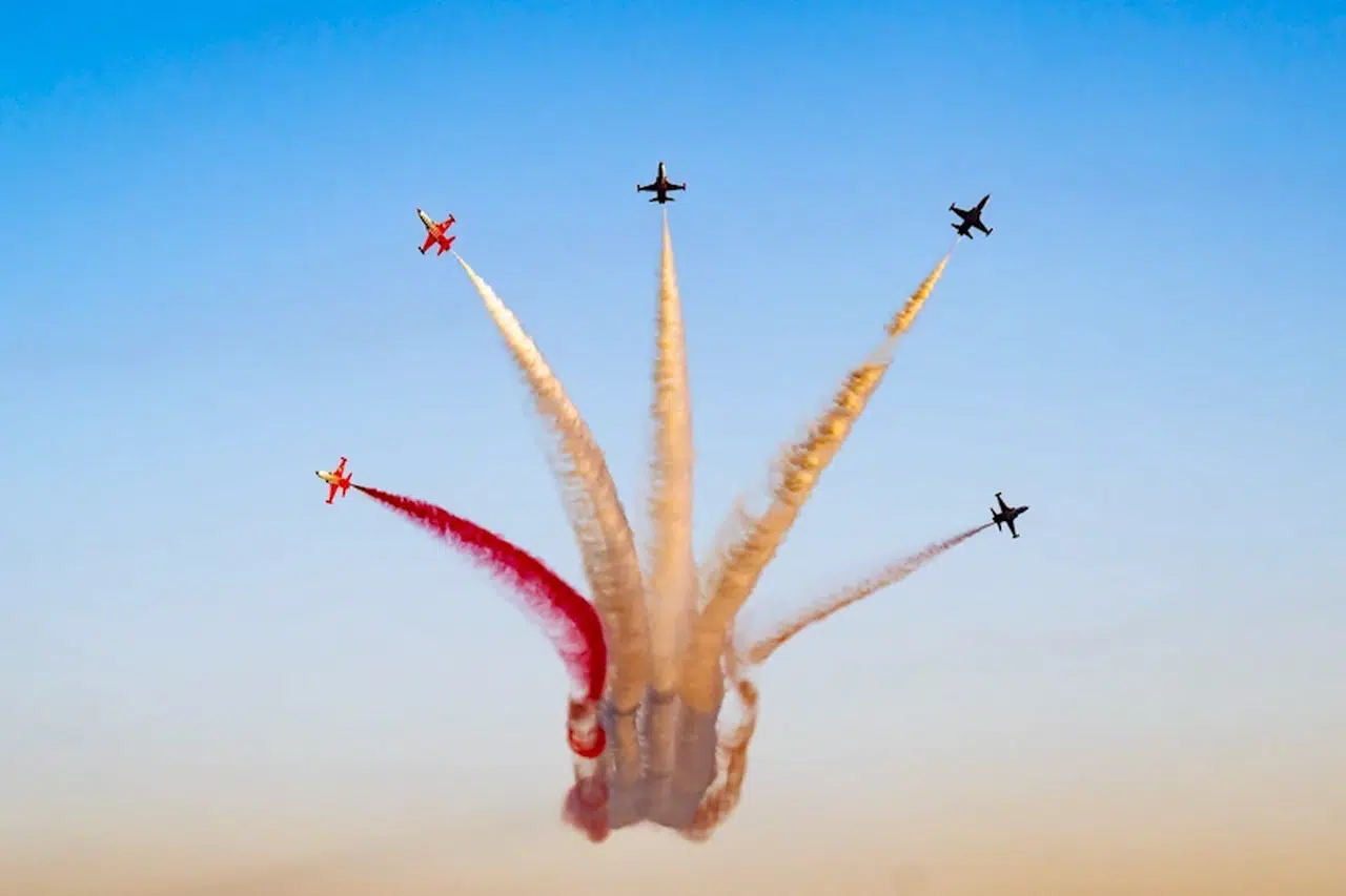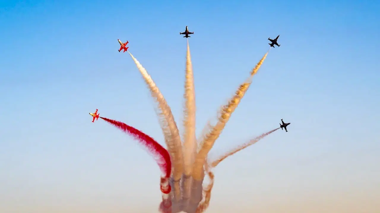 Mersin Valisi Atilla Toros ile Mersin Büyükşehir Belediye Başkanı Vahap Seçer, milletvekilleri ilçe belediye başkanlarının izlediği gösteride Türk Yıldızları, gökyüzünde görsel bir şölen oluşturdu. Türk Yıldızları gösteri sırasında, gökyüzünde renkli duman izleri gerçekleştirdiği hareketleri izleyen vatandaşlar cep telefonları, video kameraları ve fotoğraf makineleri ile anı kayıt altına aldı. (DHA)