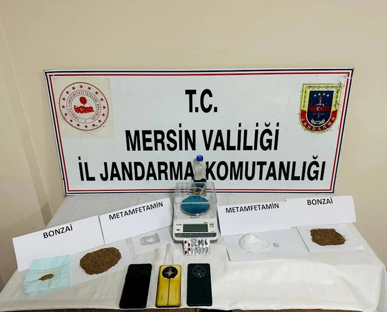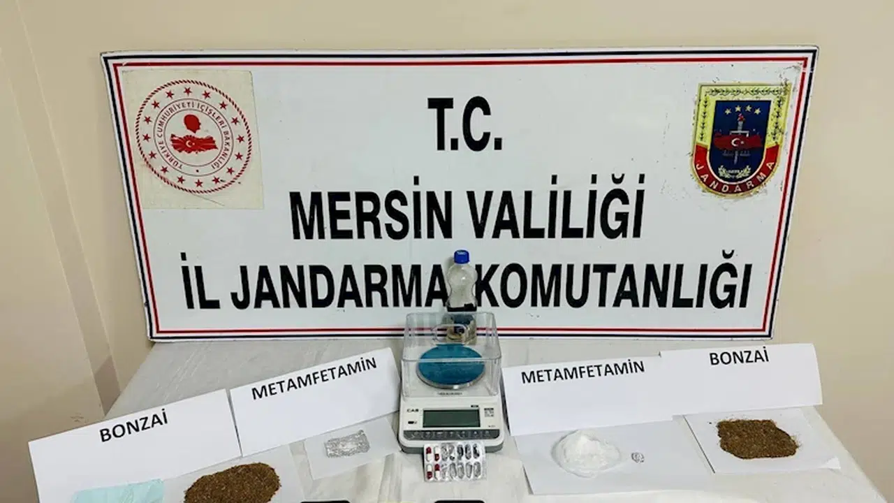 İl Jandarma Komutanlığı ekipleri Adana'dan Mersin'e 2 araç ile uyuşturucu sevk edileceğini tespit etti. Şüphelilerin yakalanması için soruşturmayı derinleştiren ekipler, uyuşturucunun sevk edileceği araçların plakalarını tespit ederek takibe aldı. Şüpheli araçlar Mersin girişinde durduruldu. Uyuşturucu madde arama köpeği ile yapılan aramalarda 277 gram bonzai, 224 gram metamfetamin, 4 sentetik hap, 3 cep telefonu, 1 hassas terazi, 1 uyuşturucu kullanma aparatına ele geçirildi. Şüpheliler E.P. ve S.C. gözaltına alındı. Jandarmadaki işlemlerinin ardından adliyeye sevk edilen şüphelilerden E.P. tutuklandı, S.C. adli kontrolle serbest bırakıldı. (DHA)